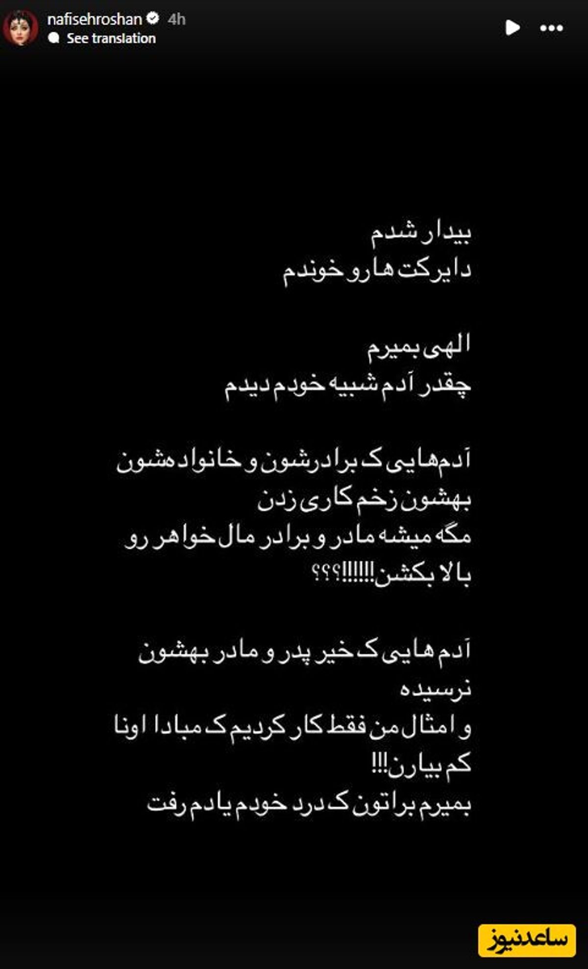 نفیسه روشن به خانواده اش حمله کرد!! | متن تند نفیسه روشن علیه مادر و برادرش +عکس
