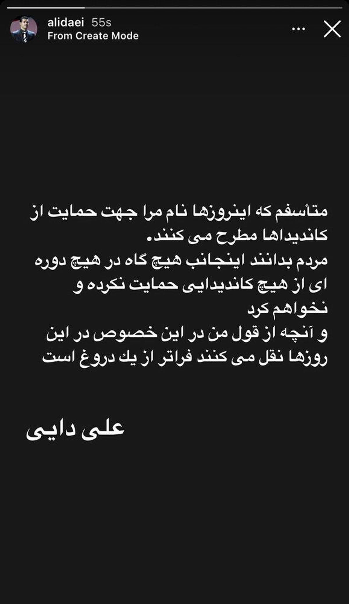 امروز عادل فردوسیپور در پیامی کوتاه شایعه حمایتش از نامزدهای انتخابات ریاست جمهوری را رد کرد و پس از او هم نوبت به علی دایی رسید تا با انتشار یک استوری اعلام کند که از هیچ کاندیدایی حمایت نخواهد کرد.