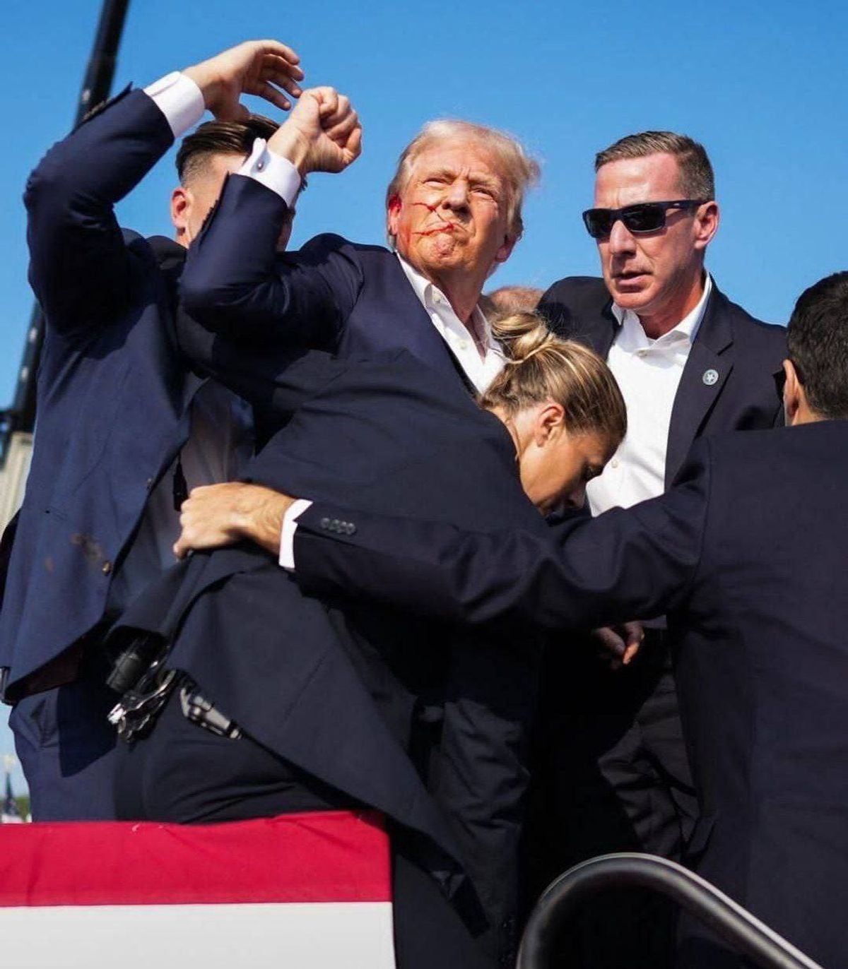 ترامپ می گوید گلوله به گوش راستش اصابت کرده است. بادیگارد زن جان خود را فدا ترامپ کرد.