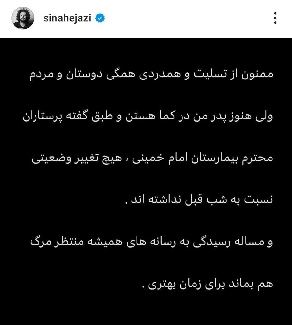 سینا حجازی فرزند صدرالدین حجازی از انتشار شایعه درگذشت پدرش انتقاد کرد.