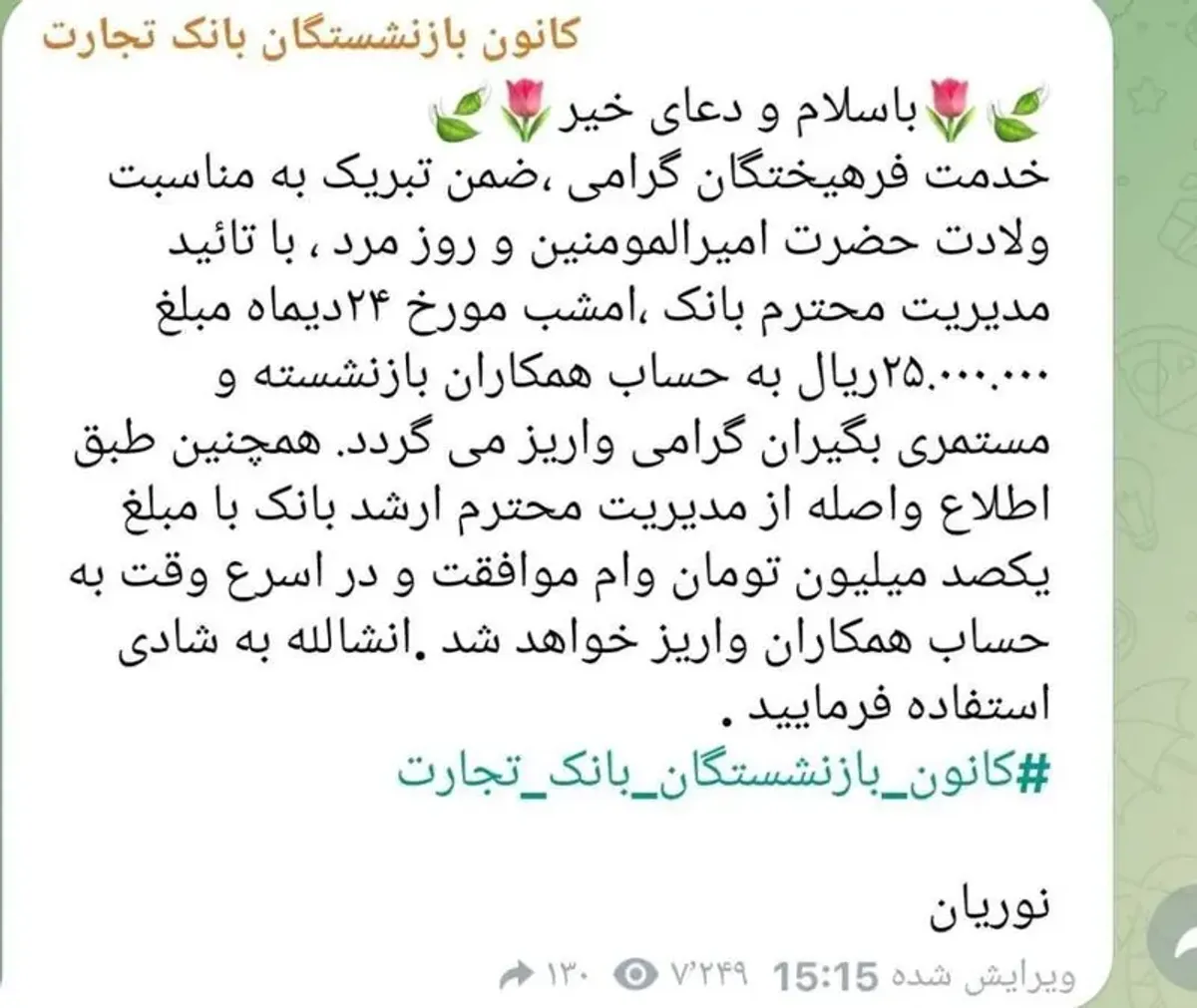 همچنین کانال تلگرامی کانون بازنشستگان بانک تجارت از واریز ۲۵/۰۰۰/۰۰۰ میلیون ریالی به حساب مستمریبگیران و بازنشستگان این بانک خبر داده است.