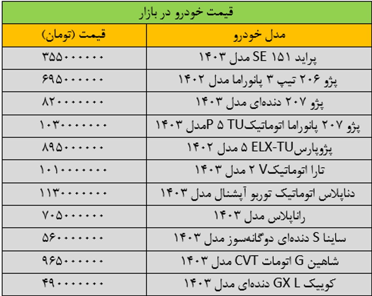بازار خودرو راکد شد؛ آخرین قیمت خودروهای پژو، سمند، شاهین، کوییک و تارا