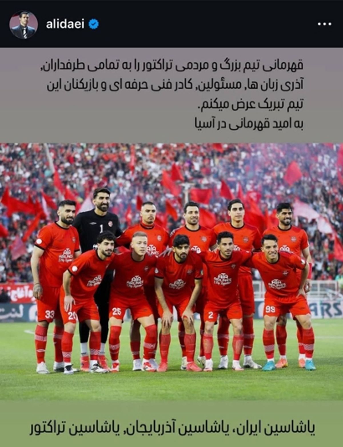 در این پست آمده است: «قهرمانی تیم بزرگ و مردمی تراکتور را به تمامی طرفداران، آذری زبانها، مسئولین، کادرفنی حرفهای و بازیکنان این تیم تبریک عرض میکنم. به امید قهرمانی در آسیا. یاشاسین ایران، یاشاسین آذربایجان، یاشاسین تراکتور.»
