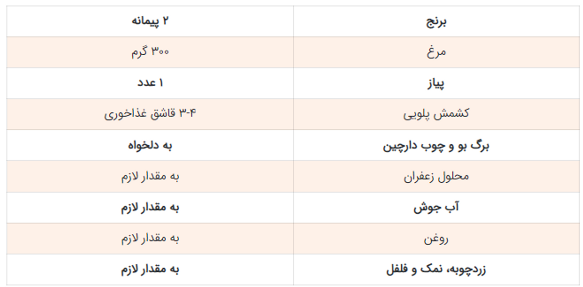 مواد لازم جهت تهیه کشمش پلو مازندرانی بامرغ زعفرانی: