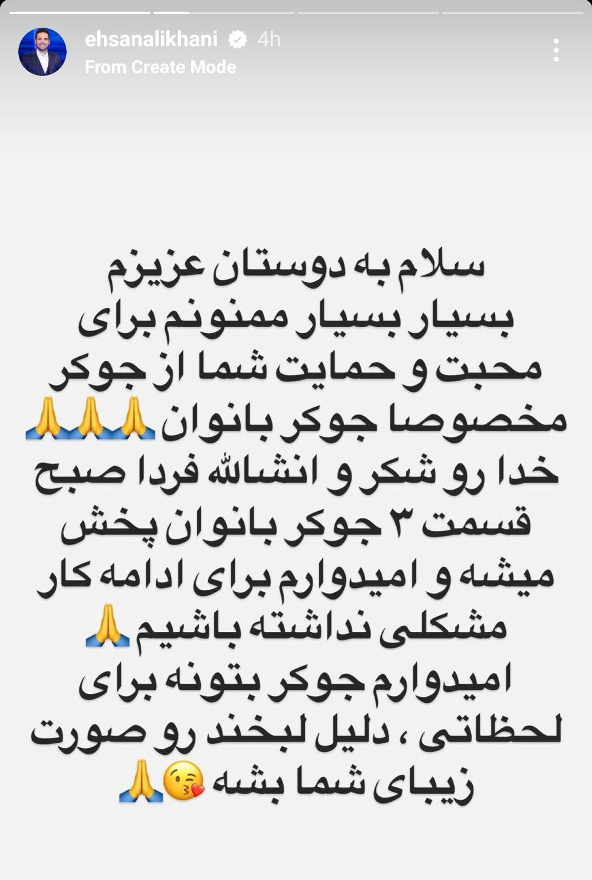 احسان علیخانی در استوری خود خبر از پخش جوکر زنان داد.