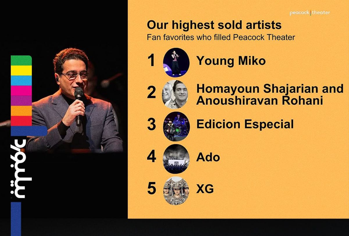وبسایت رسمی سالن «پیکاک تئاتر» لس آنجلس با انتشار یک لیست، پرمخاطبترین کنسرتهای سال ۲۰۲۴ این سالن در قلب آمریکا را معرفی کرد که همایون شجریان با فروش بیش از ۱۲ هزار بلیت، رتبه دوم این رنکیگ سالانه را از آن خود کرده است.