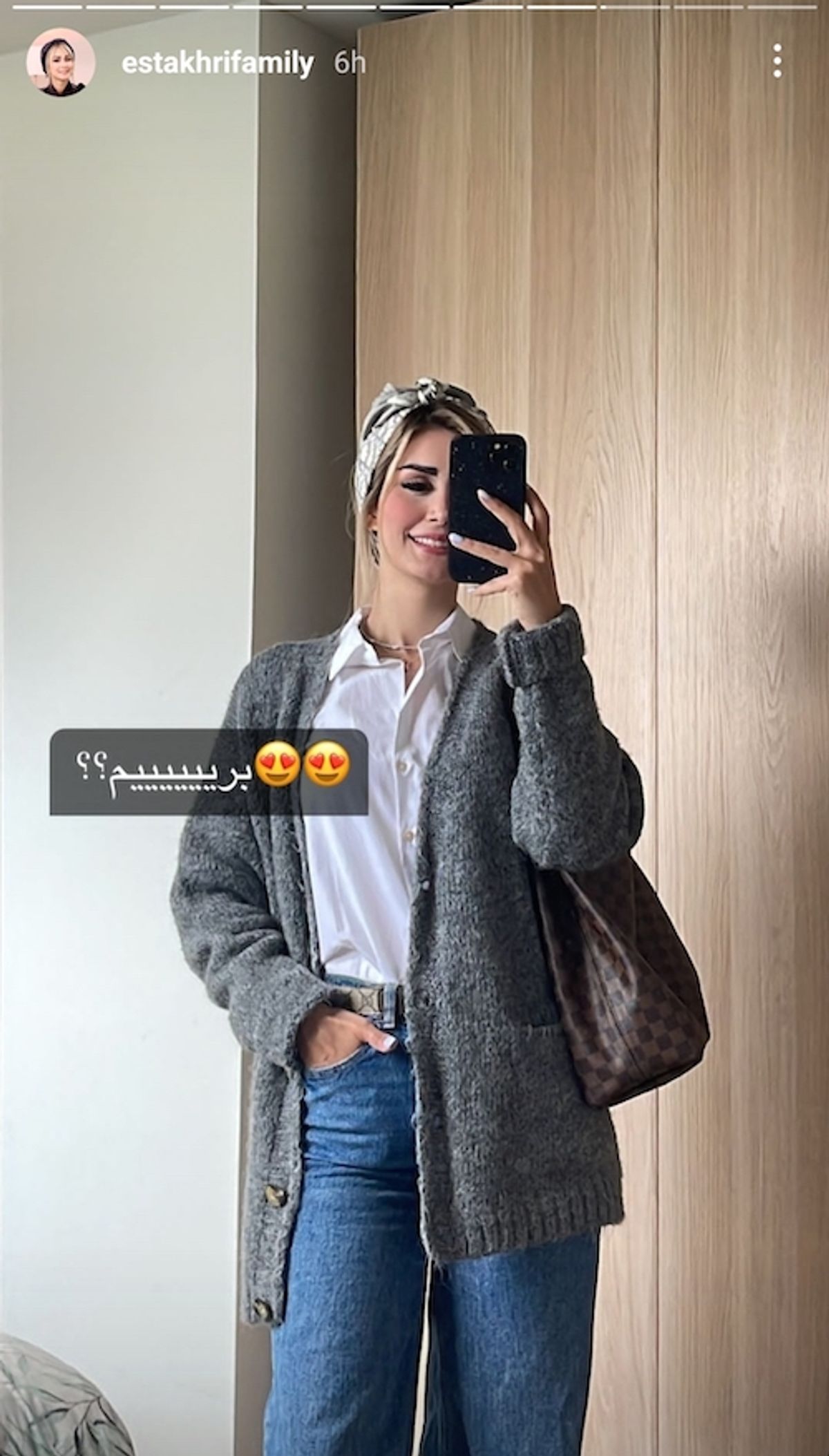 او در یکی از استوریهای جدید اینستاگرامش استایلی پاییزی شامل شومیز سفید، شلوار جین بگی و ژاکت اورسایز و بلندی به رنگ طوسی را به اشتراک گذاشتهاست. این استایل که متناسب با آب و هوای این روزهای بلژیک است، با سربند و تتبگ قهوهایرنگی کامل شدهاست.