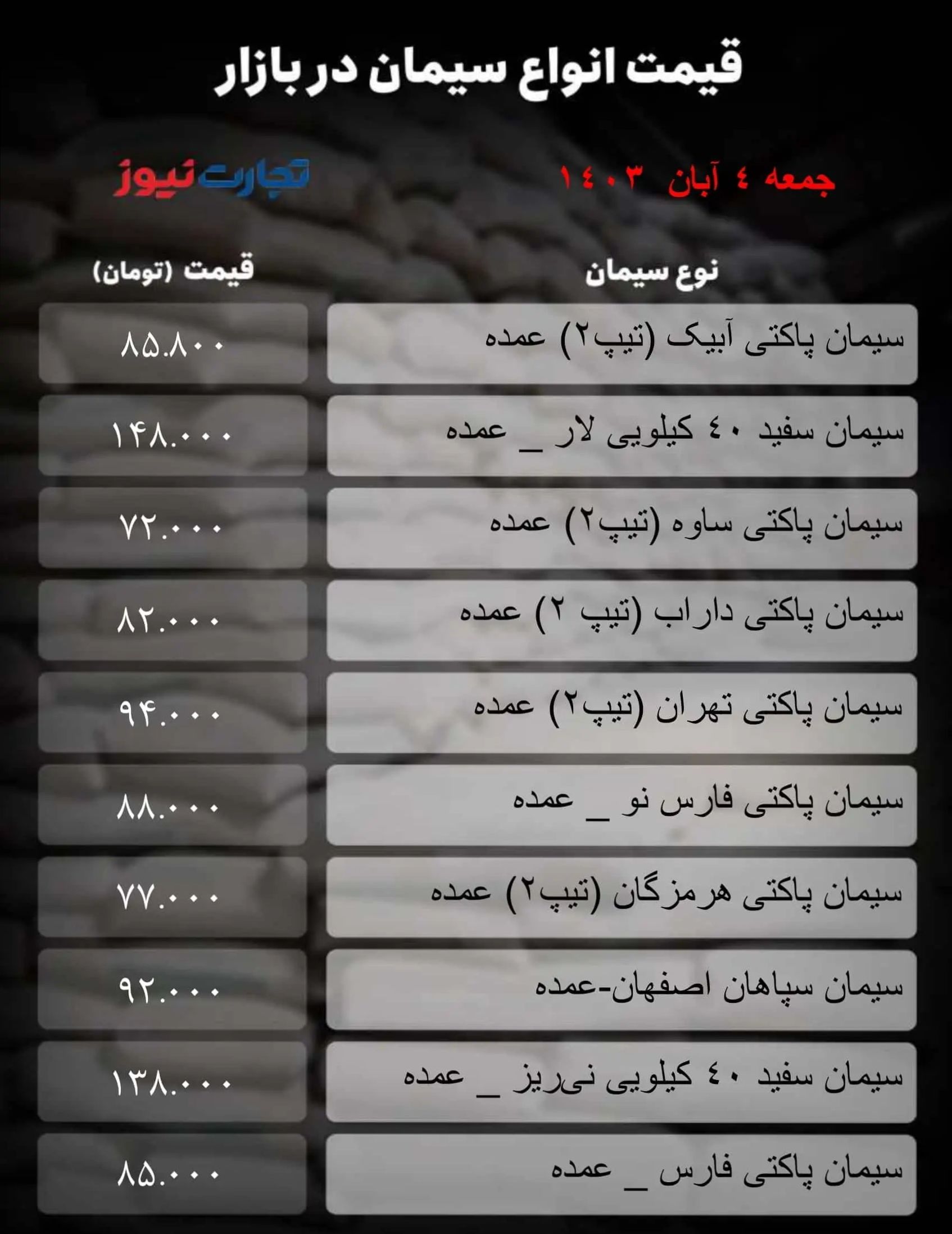 قیمت سیمان امروز جمعه ۴ آبان 1403 | لیست قیمت سیمان پاکتی