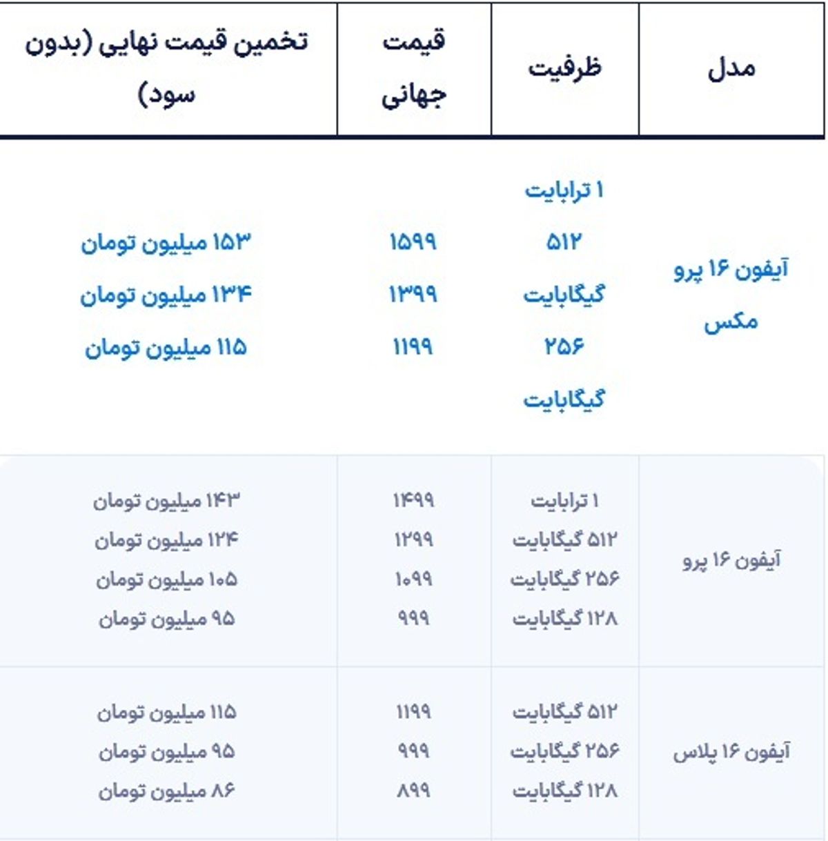 در جدول زیر، قیمت چهار مدل آیفون ۱۶ با ظرفیتهای مختلف را بهطور تقریبی محاسبه کردهایم. توجه کنید که مبالغ این جدول، قیمت تمامشده گمرکی هستند و سود واردکننده یا فروشنده در آن لحاظ نشده است.