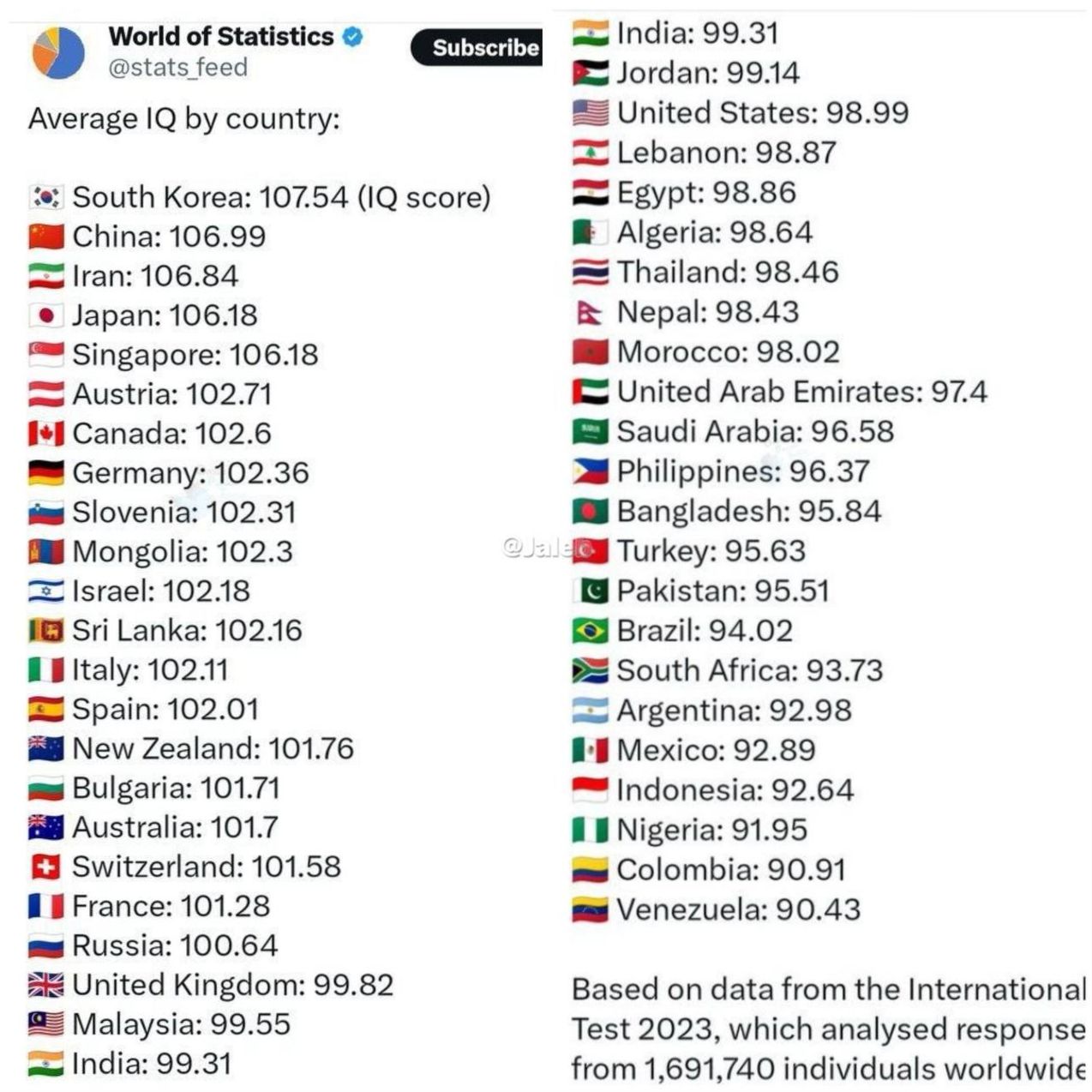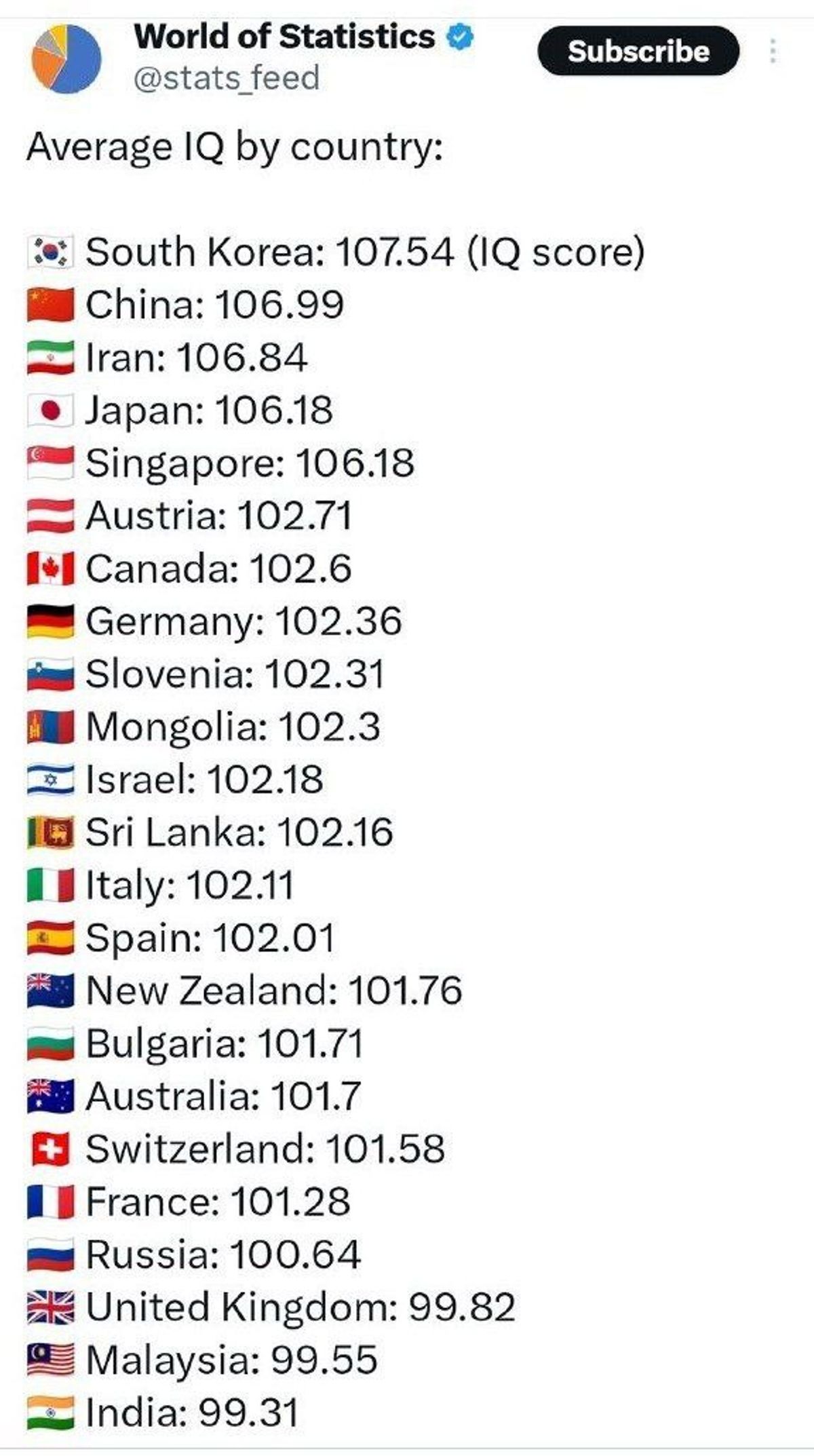 بر اساس تست آی کیو انجام شده در سال 2023 ایران در جایگاه سوم از نظر بهره هوشی قرار دارد.