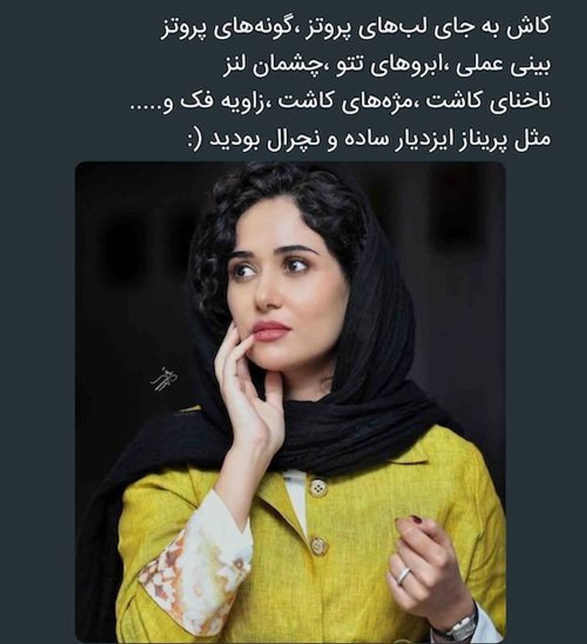 کاربری با انتشار تصویر پریناز ایزدیار مدعی شده که او نچرالترین بازیگر ایران است، در حالیکه برخی دیگر از کاربران سعی میکنند با رو کردن تصاویری قدیمی از پریناز ایزدیار این ادعا را نقض کنند.