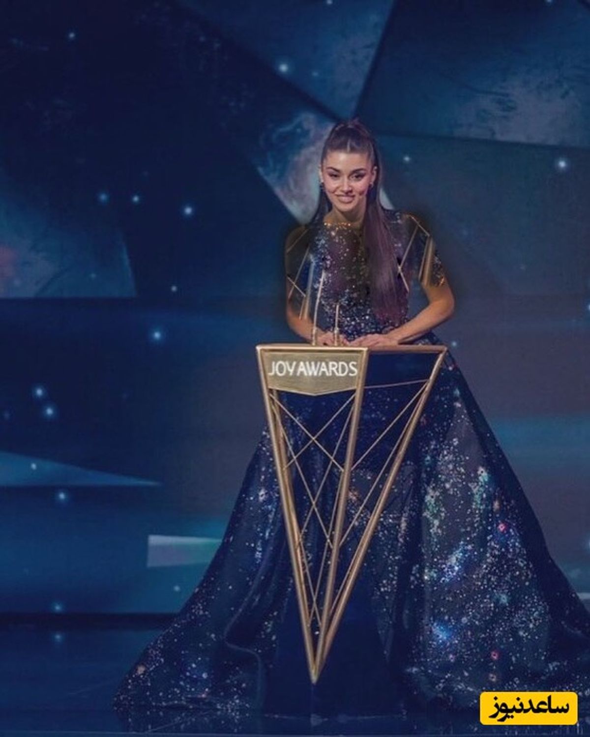 لباس به رنگ سرمهای تیره بود که در زیر نورهای صحنه، جلوهای کهکشانی و درخشان پیدا میکرد.