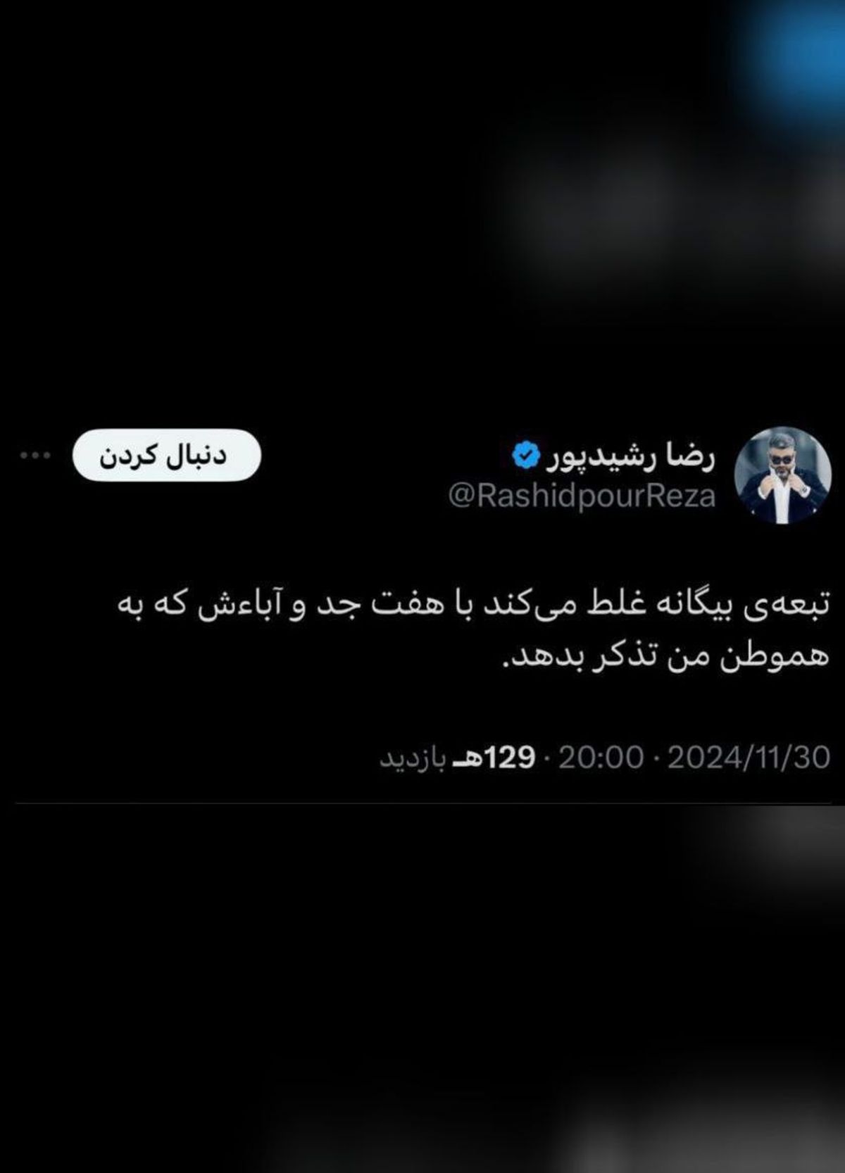 رضا رشیدپور در پستی در خصوص بحث تذکر حجاب توسط افغانها به زنان ایرانی واکنش نشان داد و گفت: تبعه خارجی غلط می کند با هفت جدش به هموطن من تذکر بدهد.