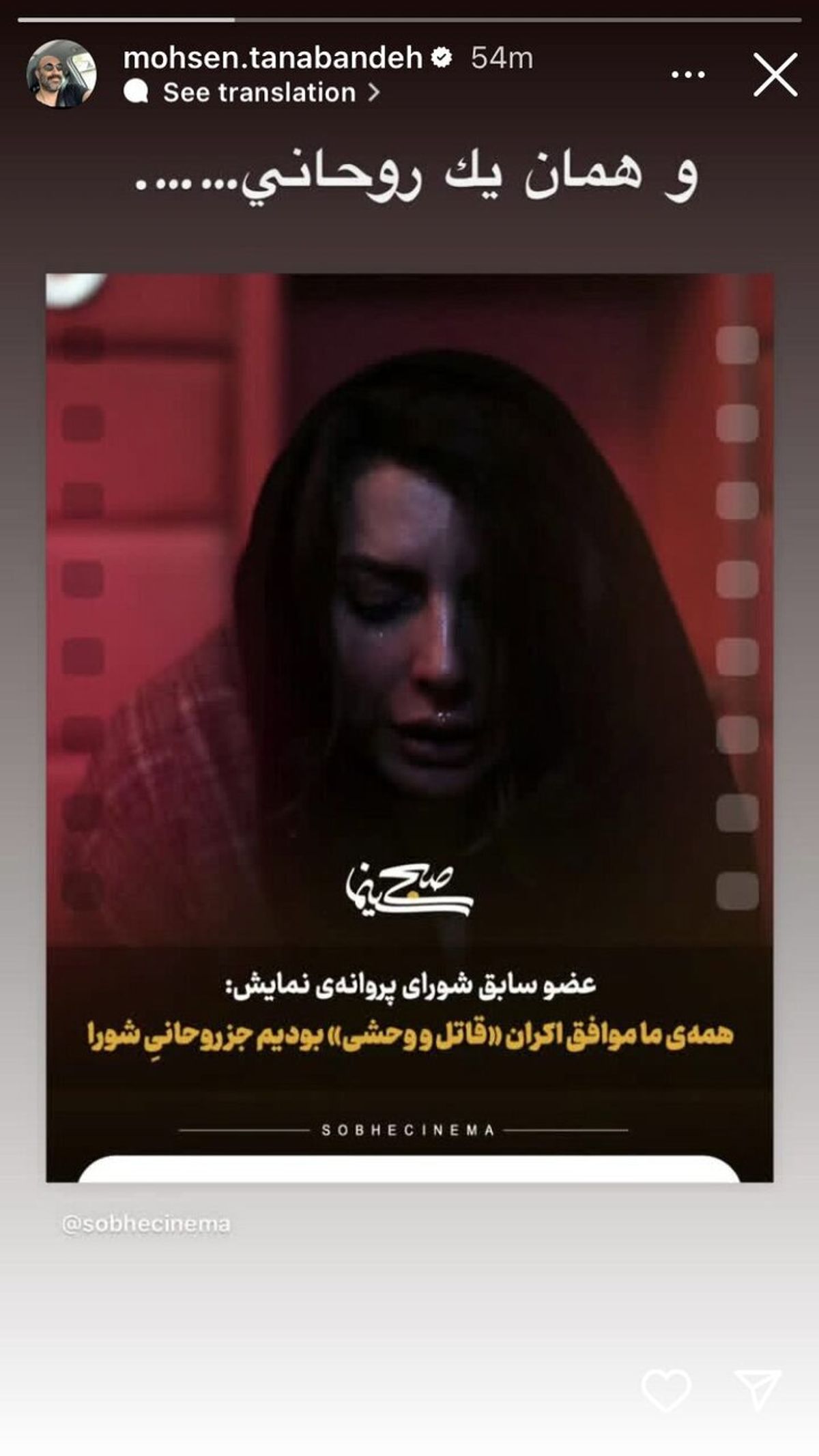 محسن تنابنده در واکنش به اینکه همه اعضای شورای پروانه نمایش موافق اکران فیلم قاتل و وحشی بودند جز یک روحانی نوشت: «و همان یک روحانی...»