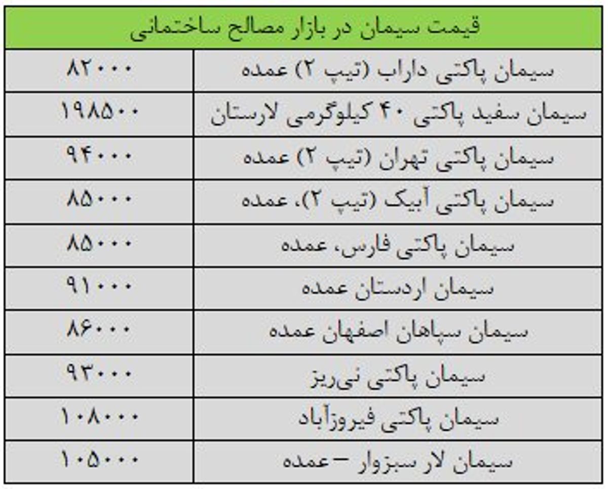 بررسیها از وضعیت قیمت سیمان حاکی از آن است که سیمان پاکتی داراب (تیپ ۲) عمده ۸۲ هزار تومان و سیمان سفید پاکتی ۴۰ کیلوگرمی لارستان ۱۹۸ هزار و ۵۰۰ تومان است.