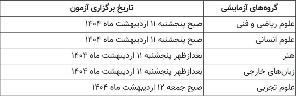 جدول زمانی آزمون کنکور هر یک از گروه های آزمایشی به شرح زیر خواهد بود :