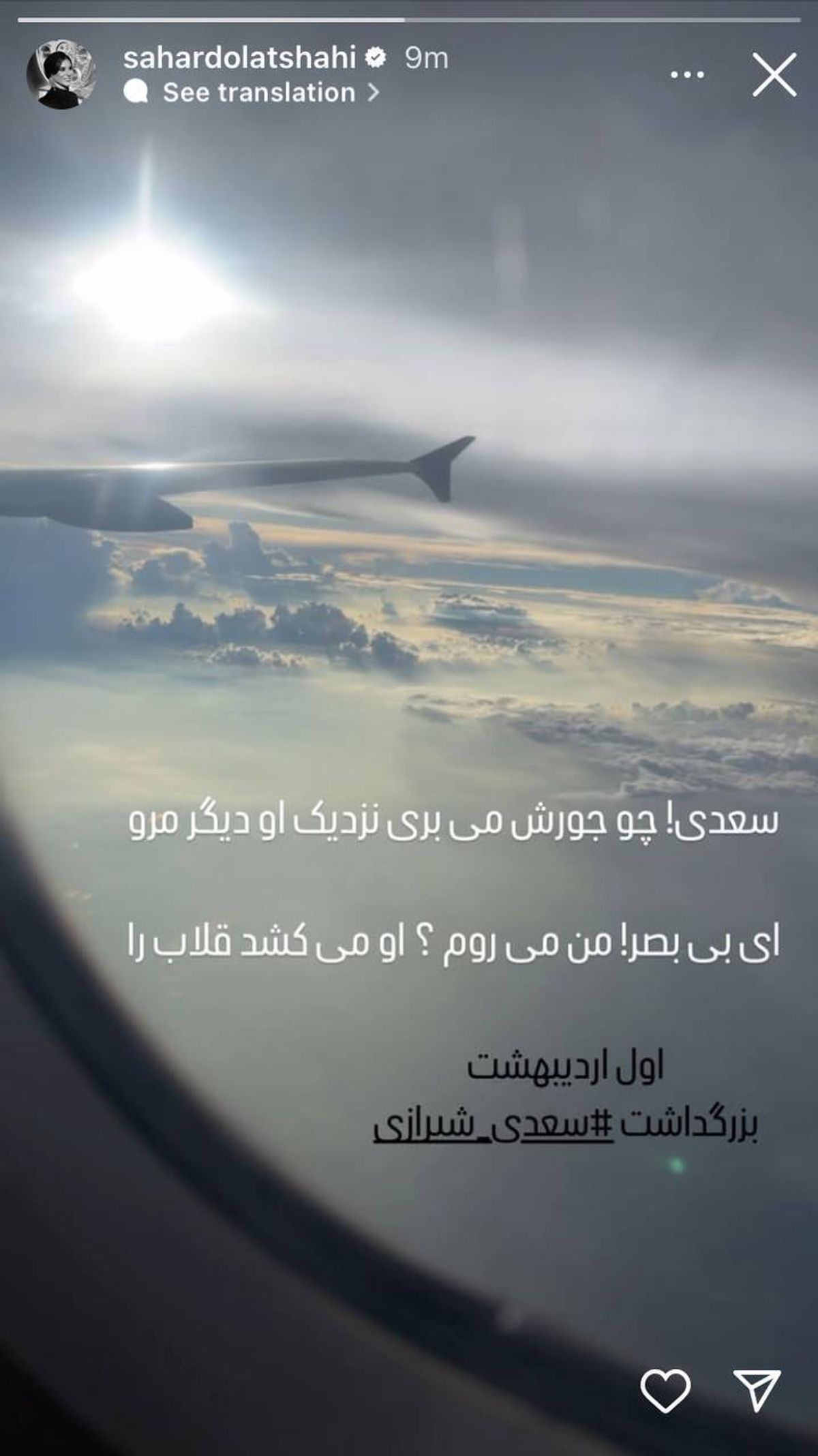 سحر دولتشاهی در حال پرواز شعر معناداری از سعدی را استوری کرد.