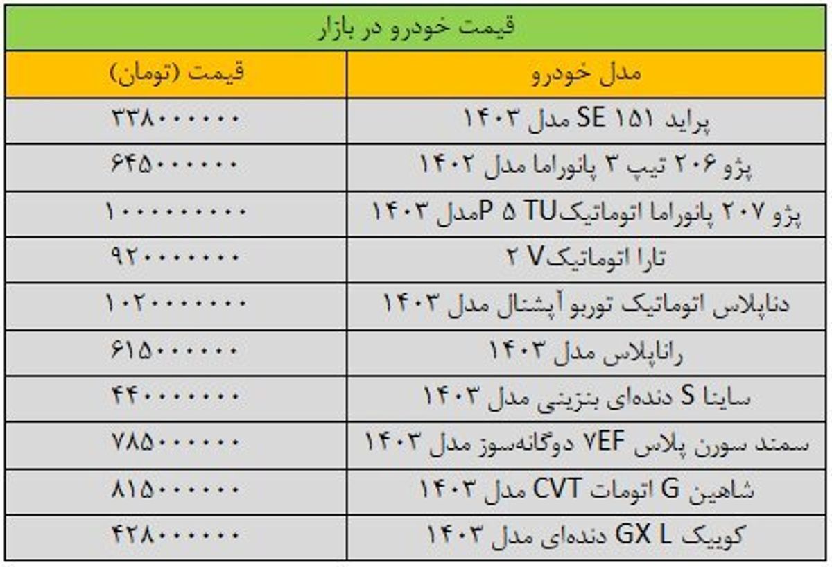 راناپلاس مدل ۱۴۰۳ نیز با افزایش ۵ میلیون تومانی ۶۱۵ میلیون تومان قیمت پیدا کرد. راناپلاس مدل ۱۴۰۲ در بازار با افزایش ۵ میلیون تومانی ۵۹۰ میلیون تومان به فروش رفت. همچنین ساینا S دندهای بنزینی مدل ۱۴۰۳ در بازار با افزایش ۱۷ میلیون تومانی ۴۴۰ میلیون تومان و ساینا S دندهای بنزینی مدل ۱۴۰۲ هم با افزایش ۵ میلیون تومانی ۴۱۰ میلیون تومان قیمت خورده است. اما سمند سورن پلاس EF ۷ دوگانهسوز مدل ۱۴۰۳ در بازار با افزایش ۱۰ میلیون تومانی ۷۸۵ میلیون تومان فروخته شد.