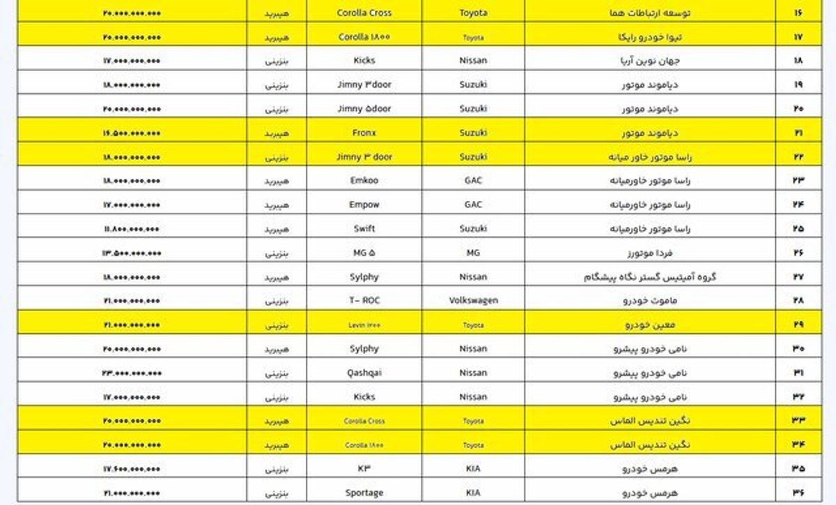 محصولات اضافه شده به لیست که اکثراً هم دو مدل از محصولات گروه تویوتا هستند اما توسط شرکتهای واردکننده مختلف وارد میشوند، با رنگ زرد مشخص شدهاند.
