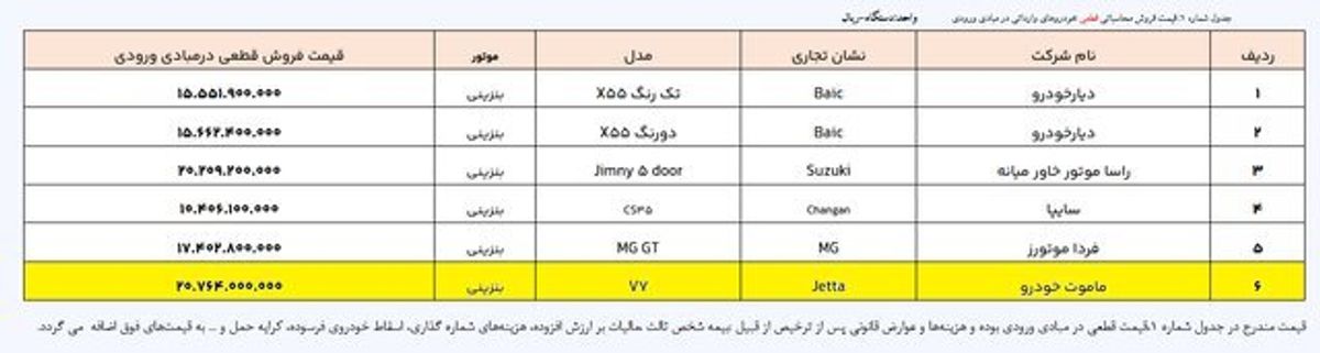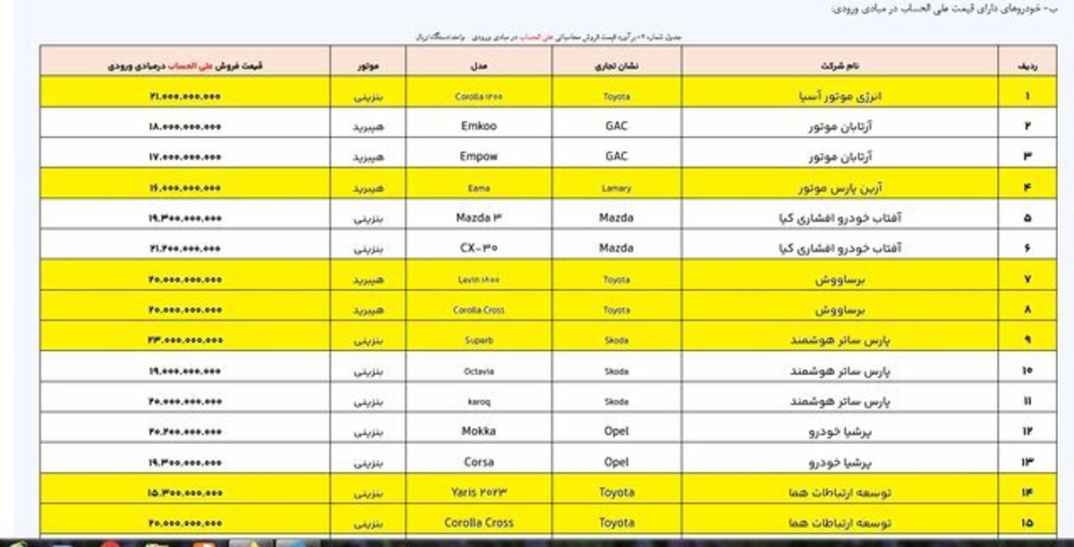 لیست خودروهای دارای قیمت علیالحساب در مبادی ورودی: