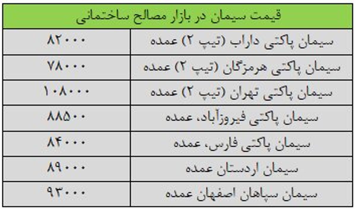 همچنین سیمان پاکتی تهران (تیپ ۲) عمده ۱۰۸ هزار تومان و سیمان پاکتی فیروزآباد، عمده ۸۸ هزار و ۵۰۰ تومان است.