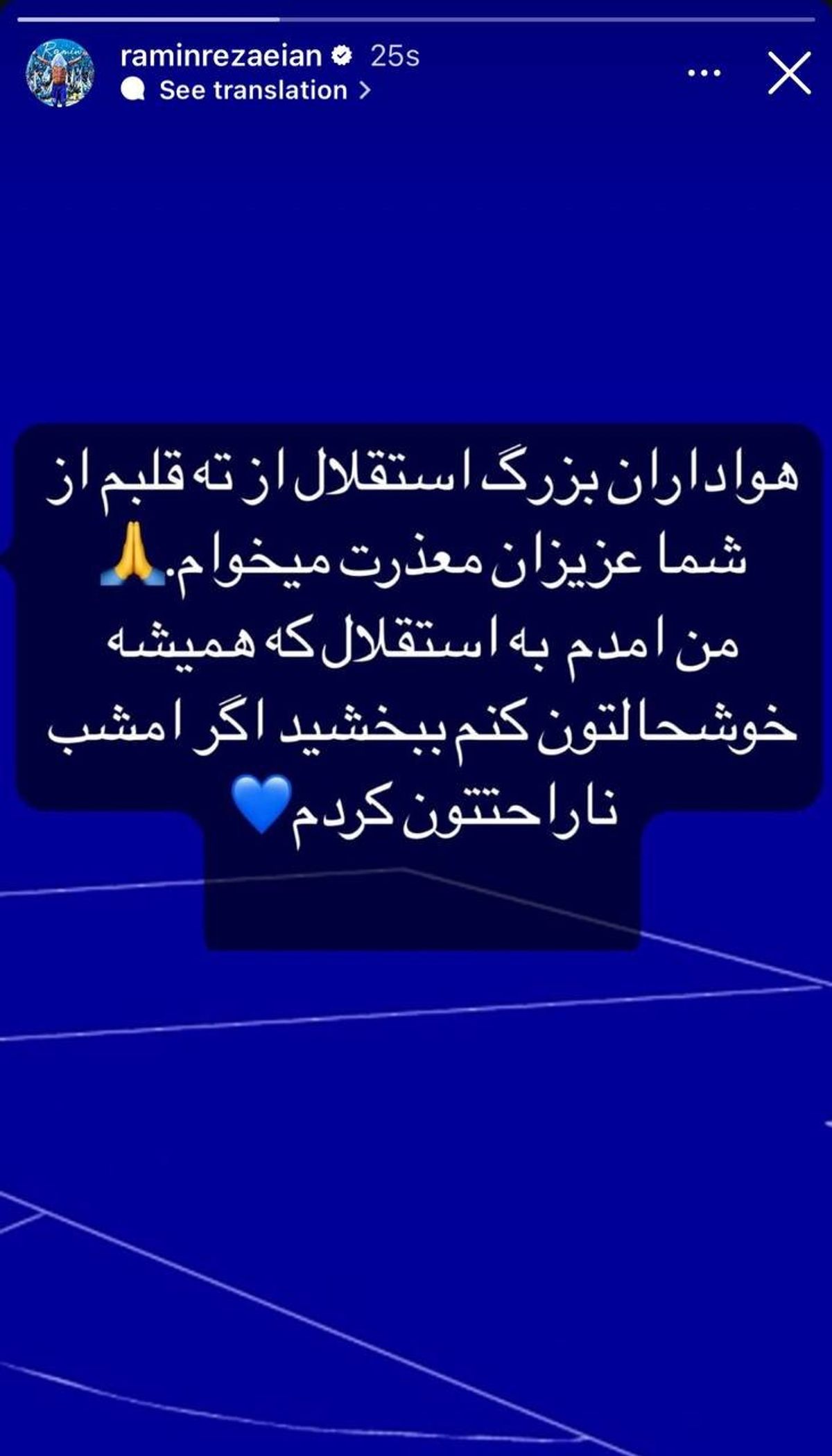 رامین رضاییان با انتشار یک استوری از هواداران استقلال عذرخواهی کرد.