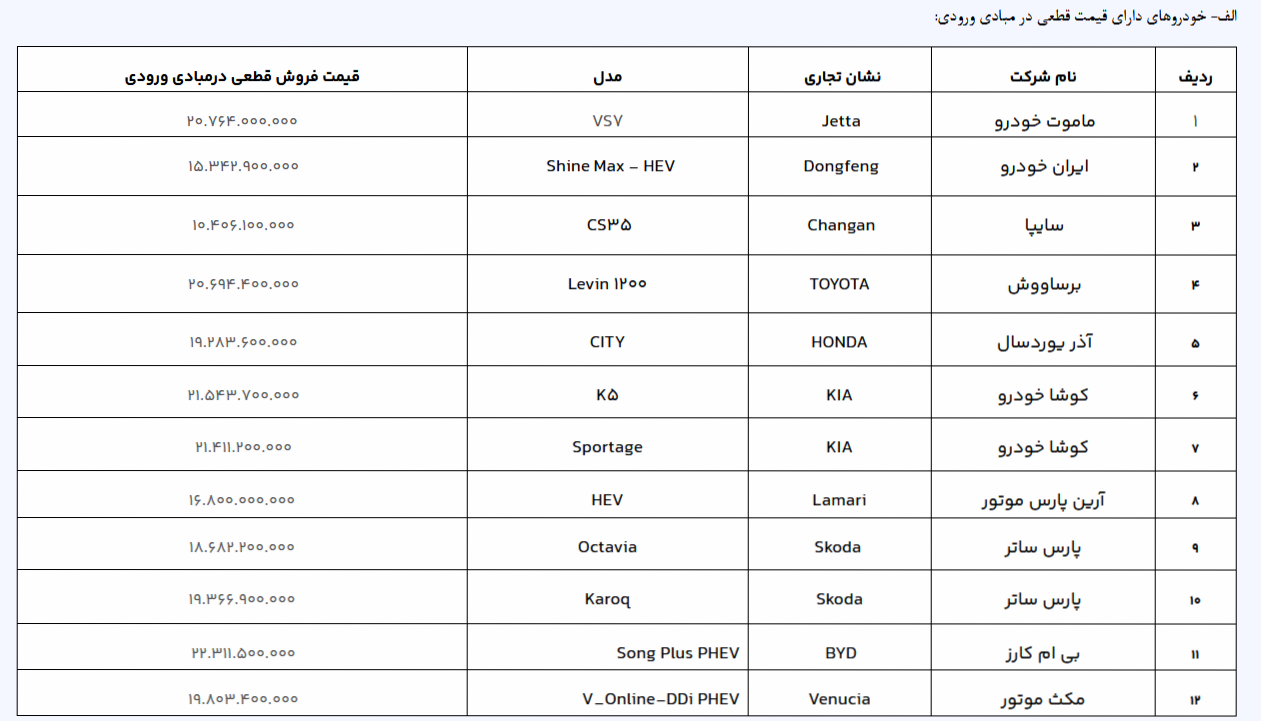 تاکید میشود که قیمتهای مندرج در جداول بالا، قیمت قطعی یا علیالحساب خودروها در مبادی ورودی بوده و هزینهها و عوارض قانونی پس از ترخیص (نظیر بیمه شخص ثالث، مالیات بر ارزش افزوده، هزینههای شمارهگذاری، اسقاط خودروی فرسوده، کرایه حمل و ...) به این مبالغ اضافه میشود.