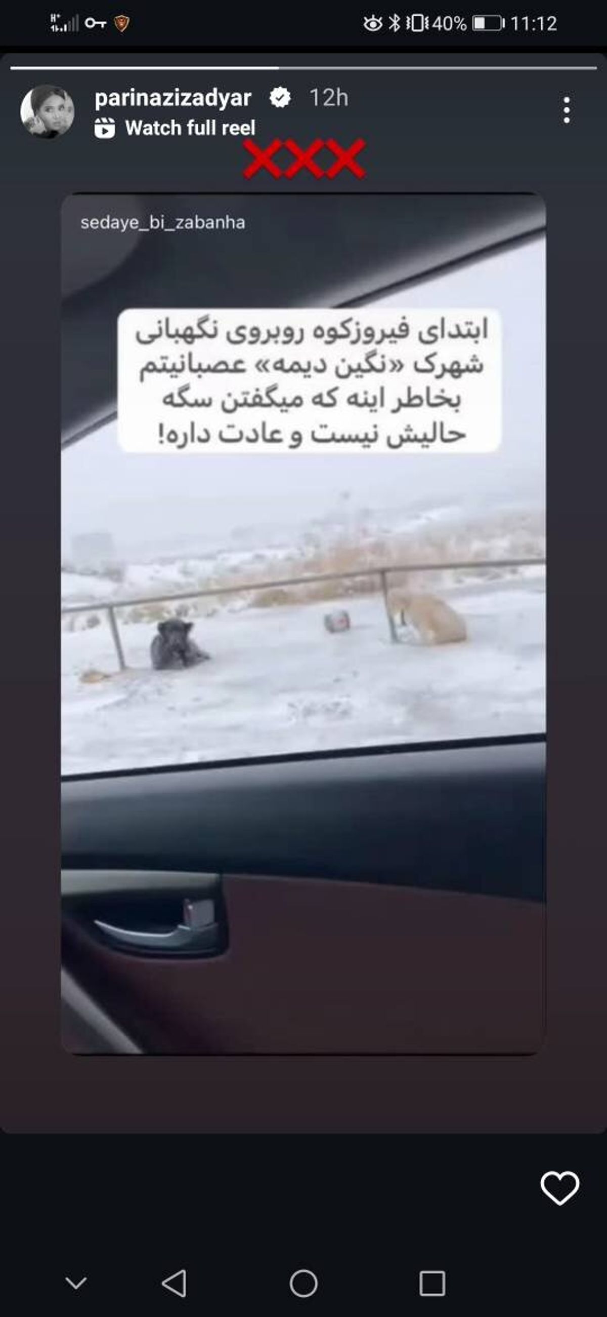 پریناز ایزدیار بازیگر سینمای ایران با انتشار یک ویدئو در استوری خود نسبت به عدم توجه به زندگی حیواناتِ بی پناه در سرما واکنش نشان داد.