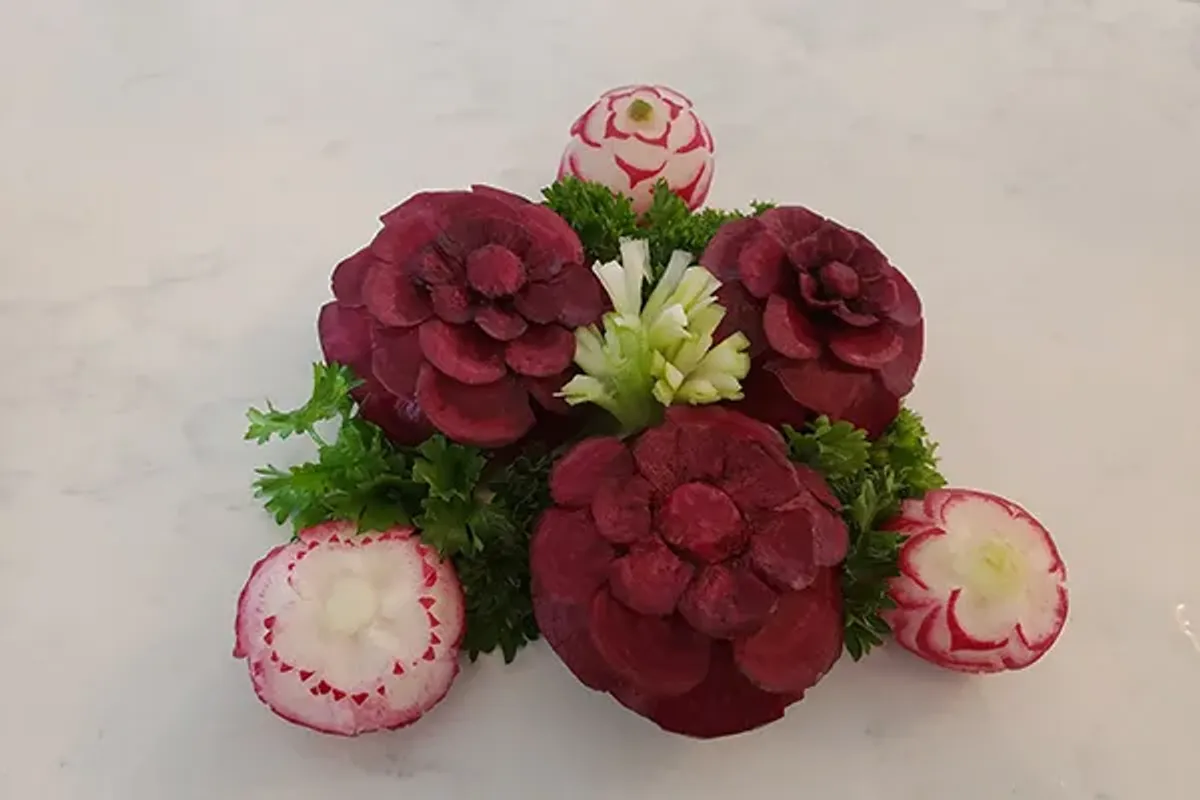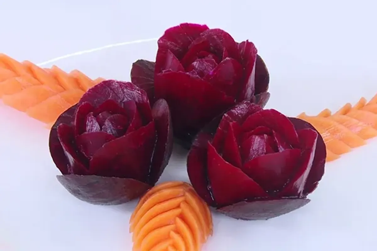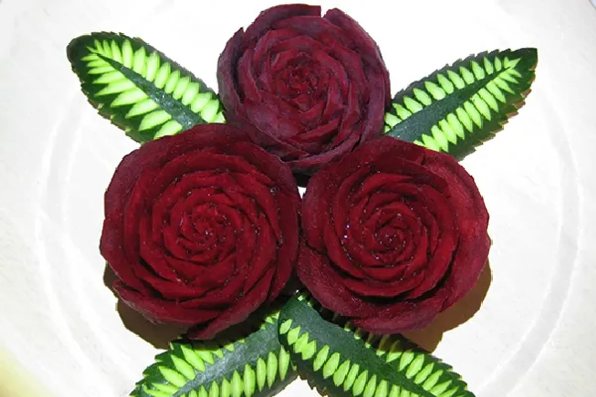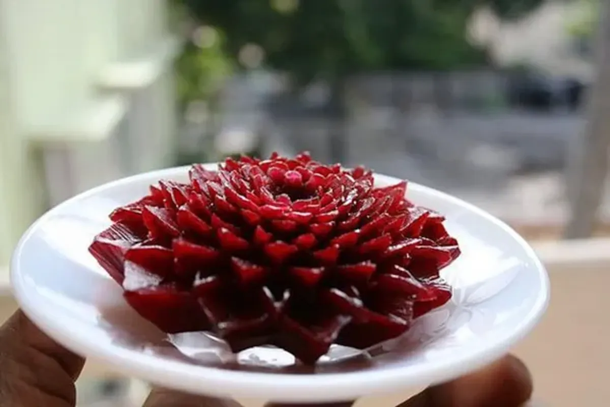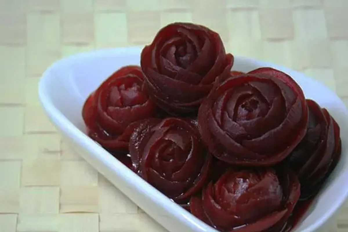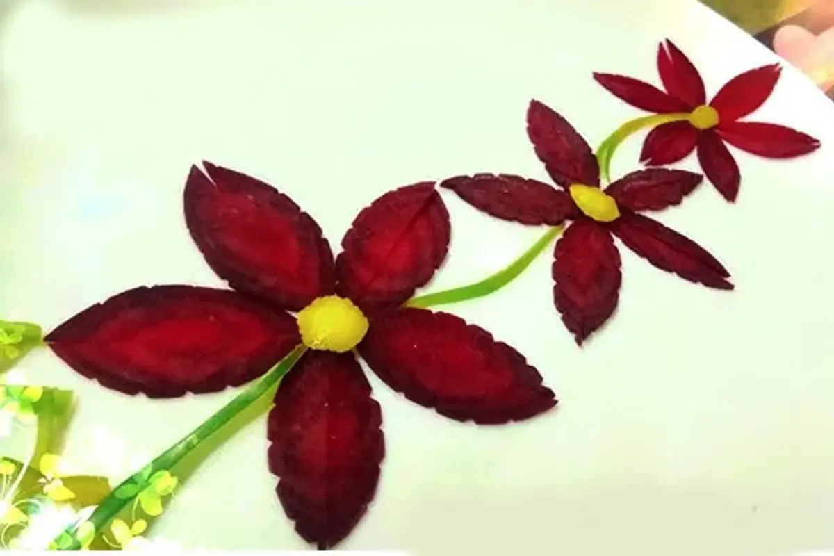 گلهای لبو: تکههای لبو را به شکل گلبرگ برش داده و با سیخ چوبی به هم متصل کنید تا گلهای زیبایی ایجاد شود.