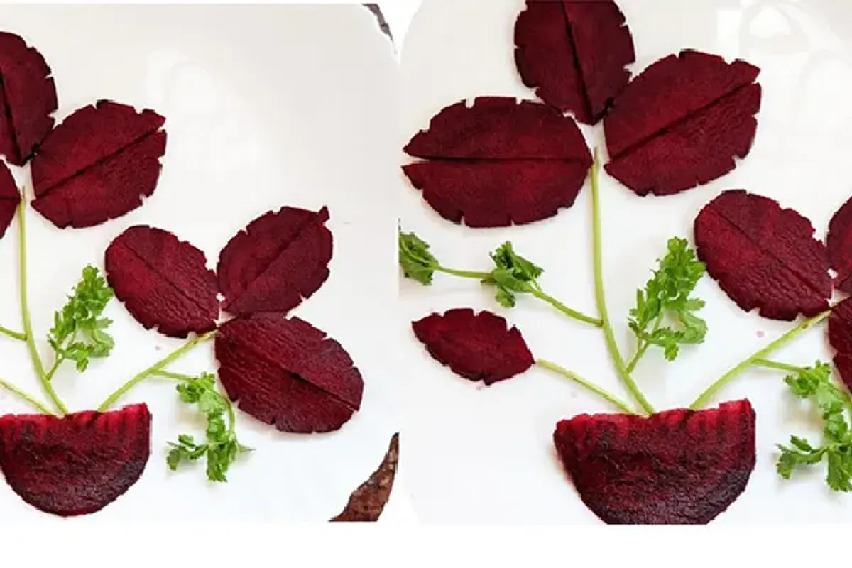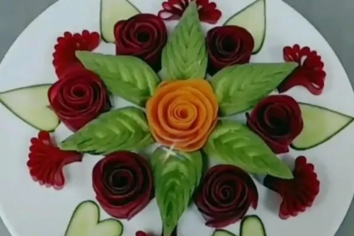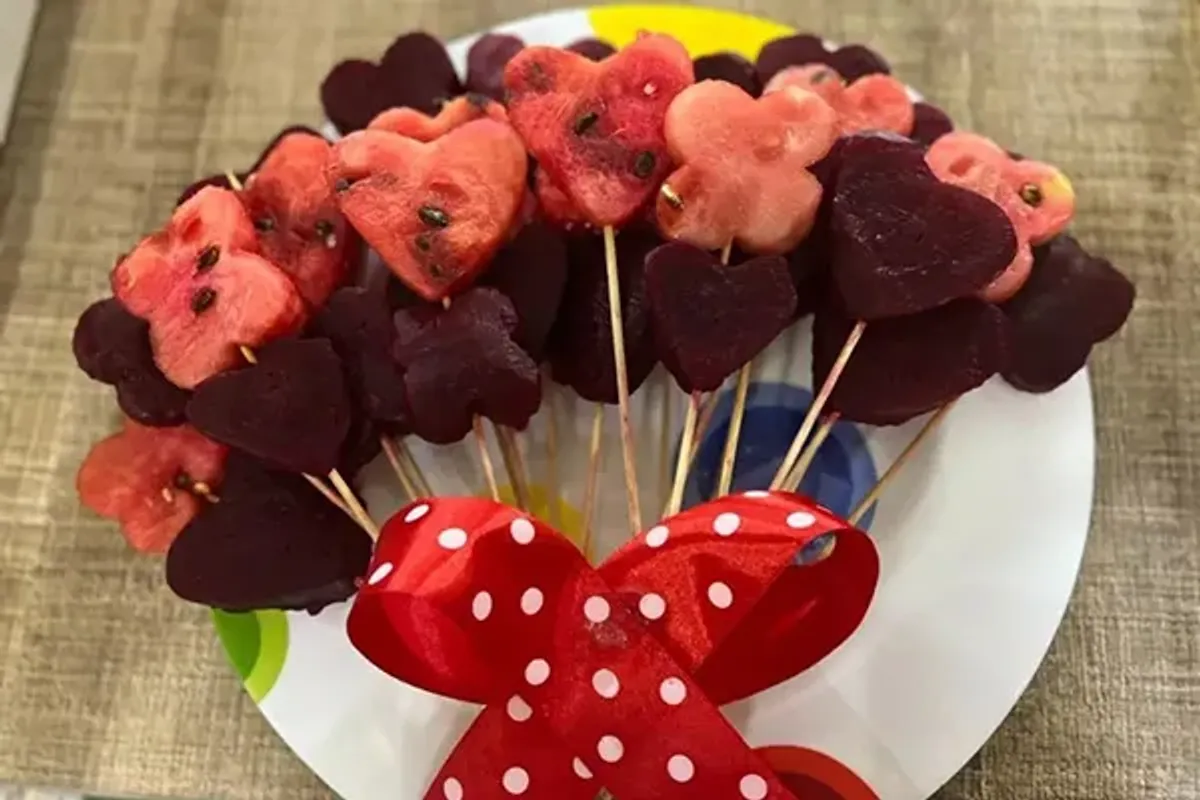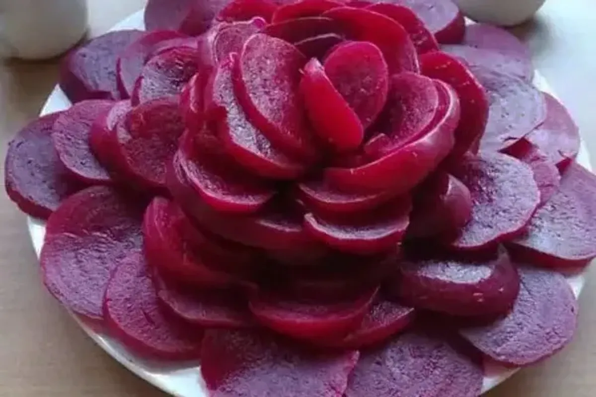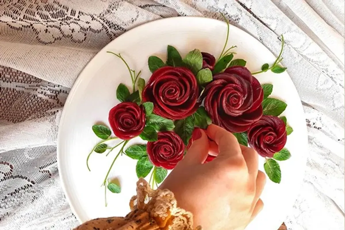 گلهای لبو: تکههای لبو را به شکل گلبرگ برش داده و با سیخ چوبی به هم متصل کنید تا گلهای زیبایی ایجاد شود.