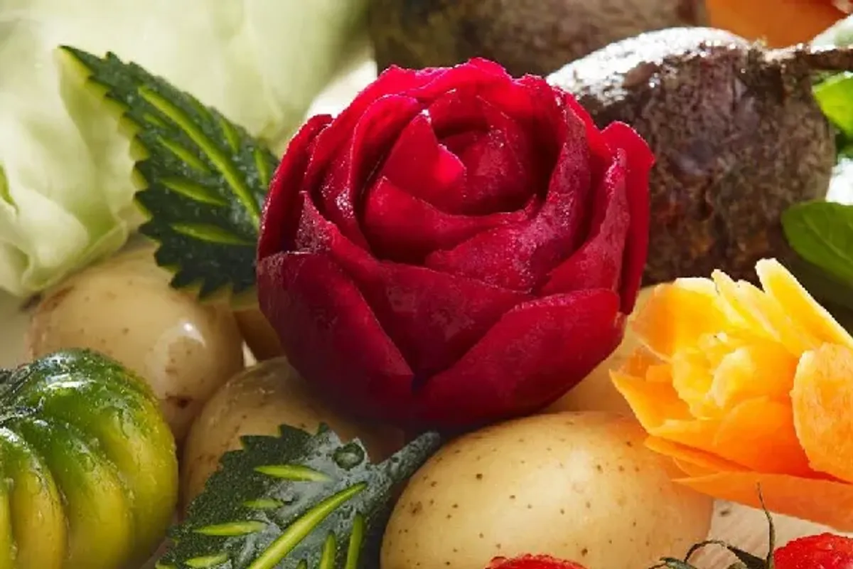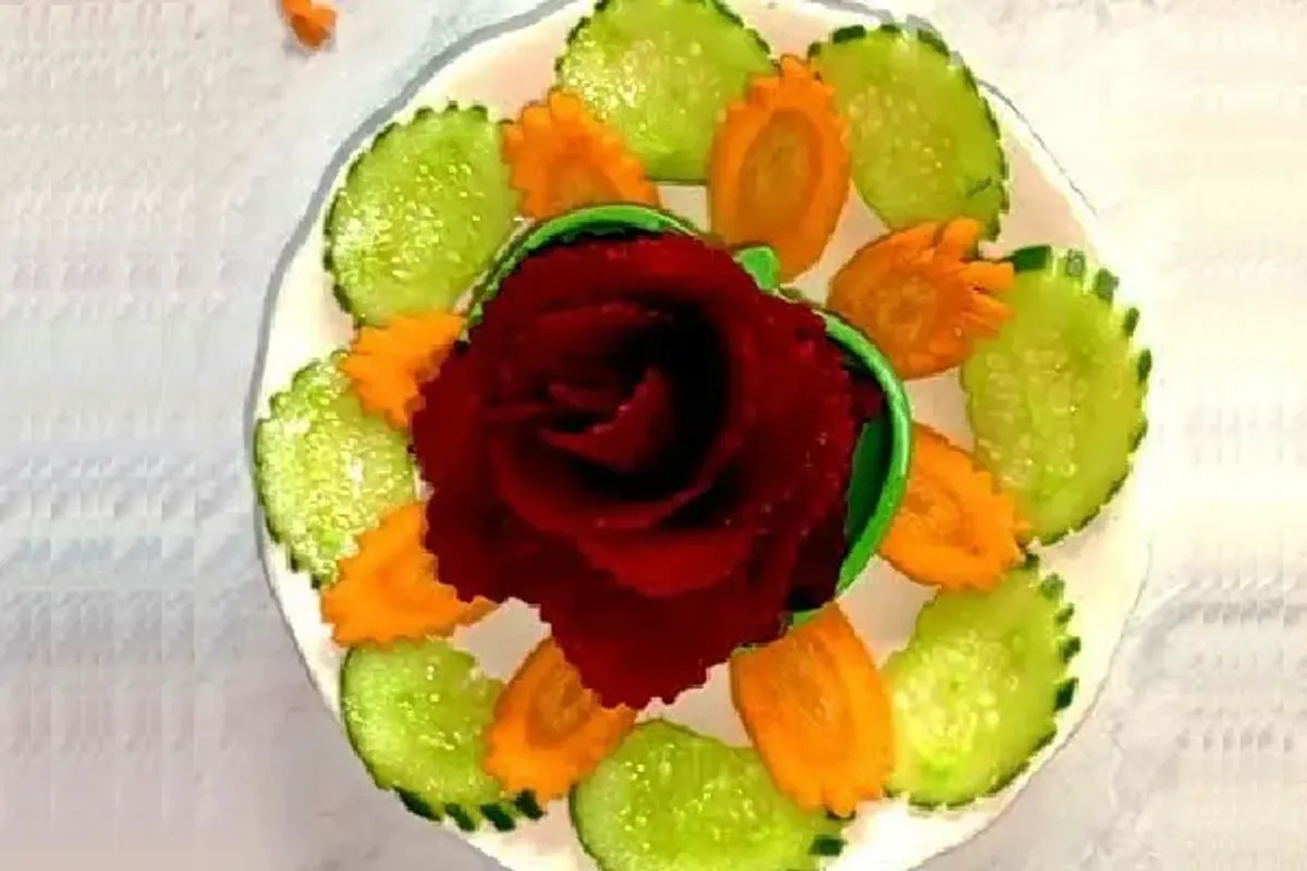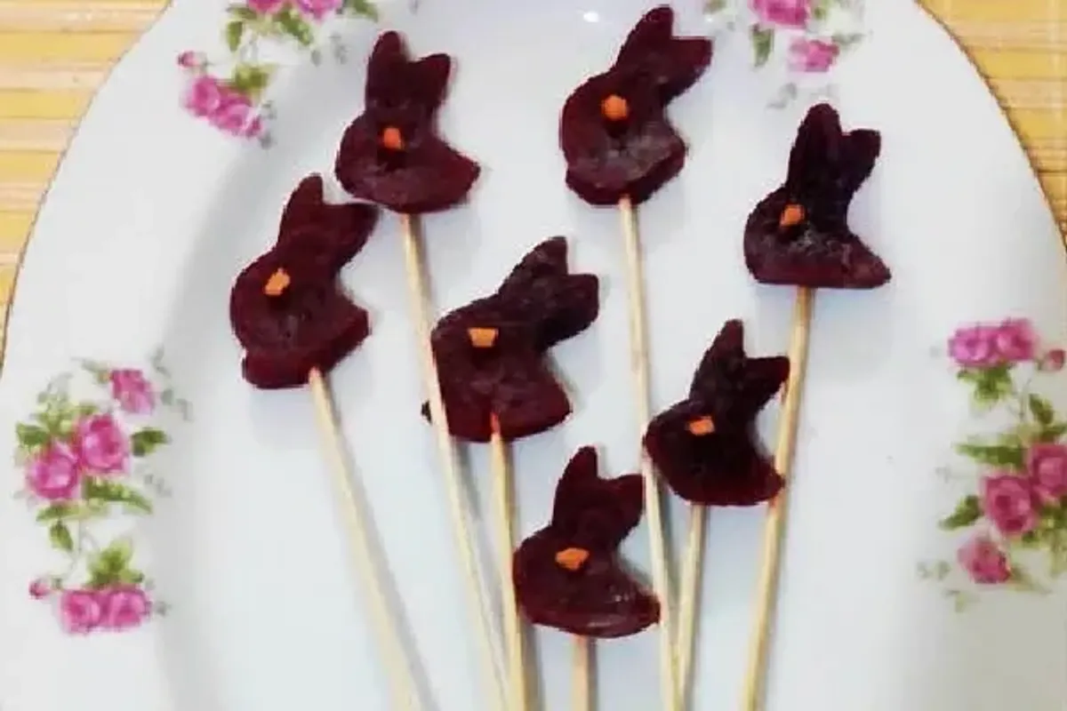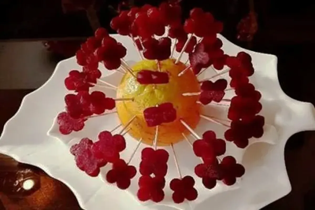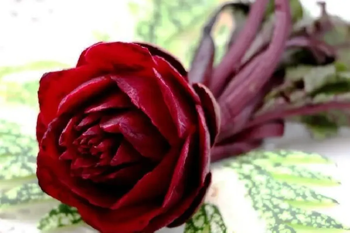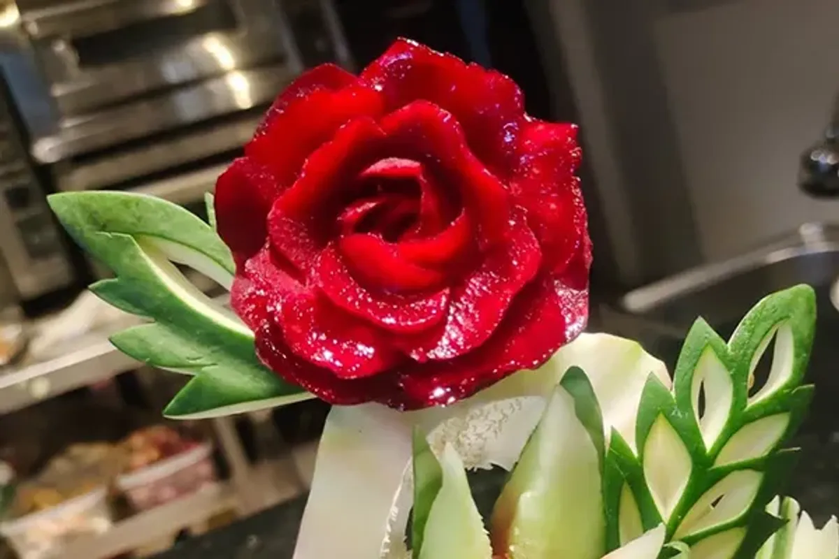 گلهای لبو: تکههای لبو را به شکل گلبرگ برش داده و با سیخ چوبی به هم متصل کنید تا گلهای زیبایی ایجاد شود.