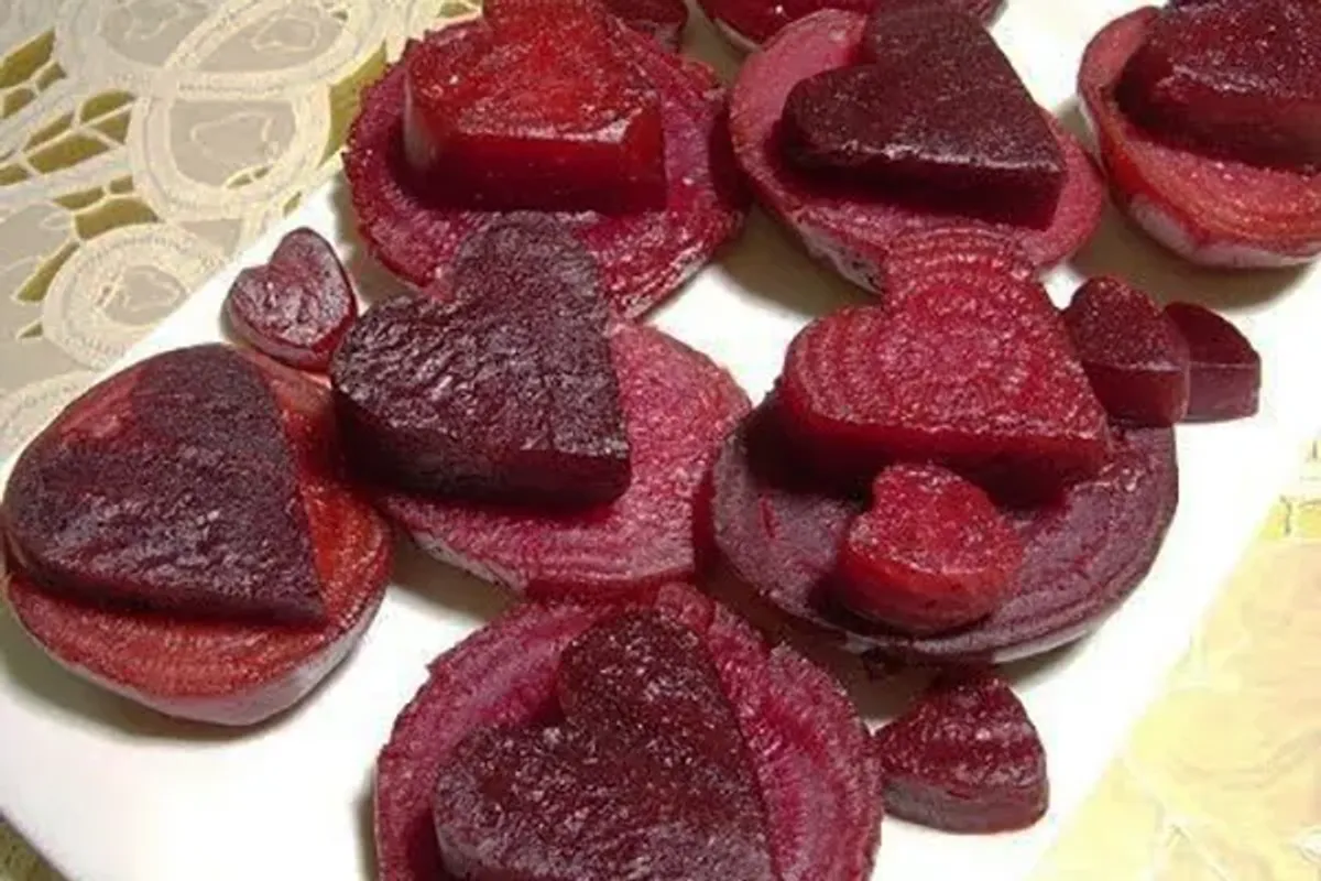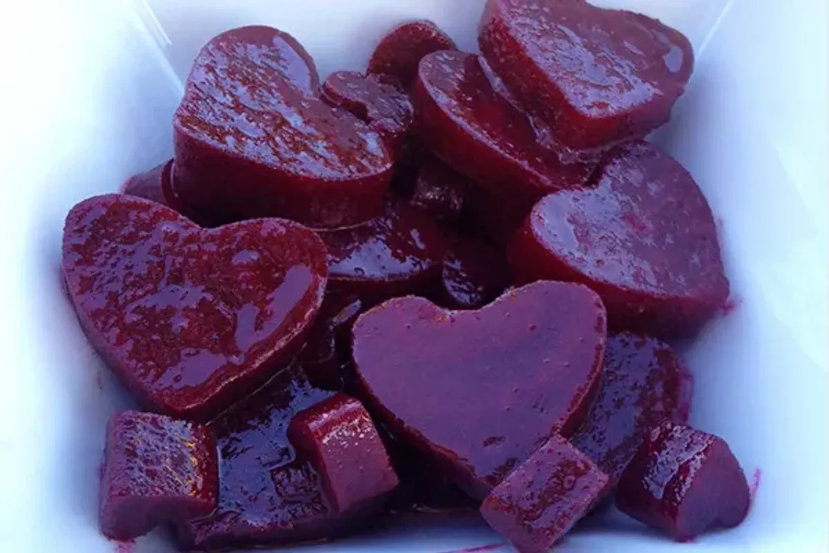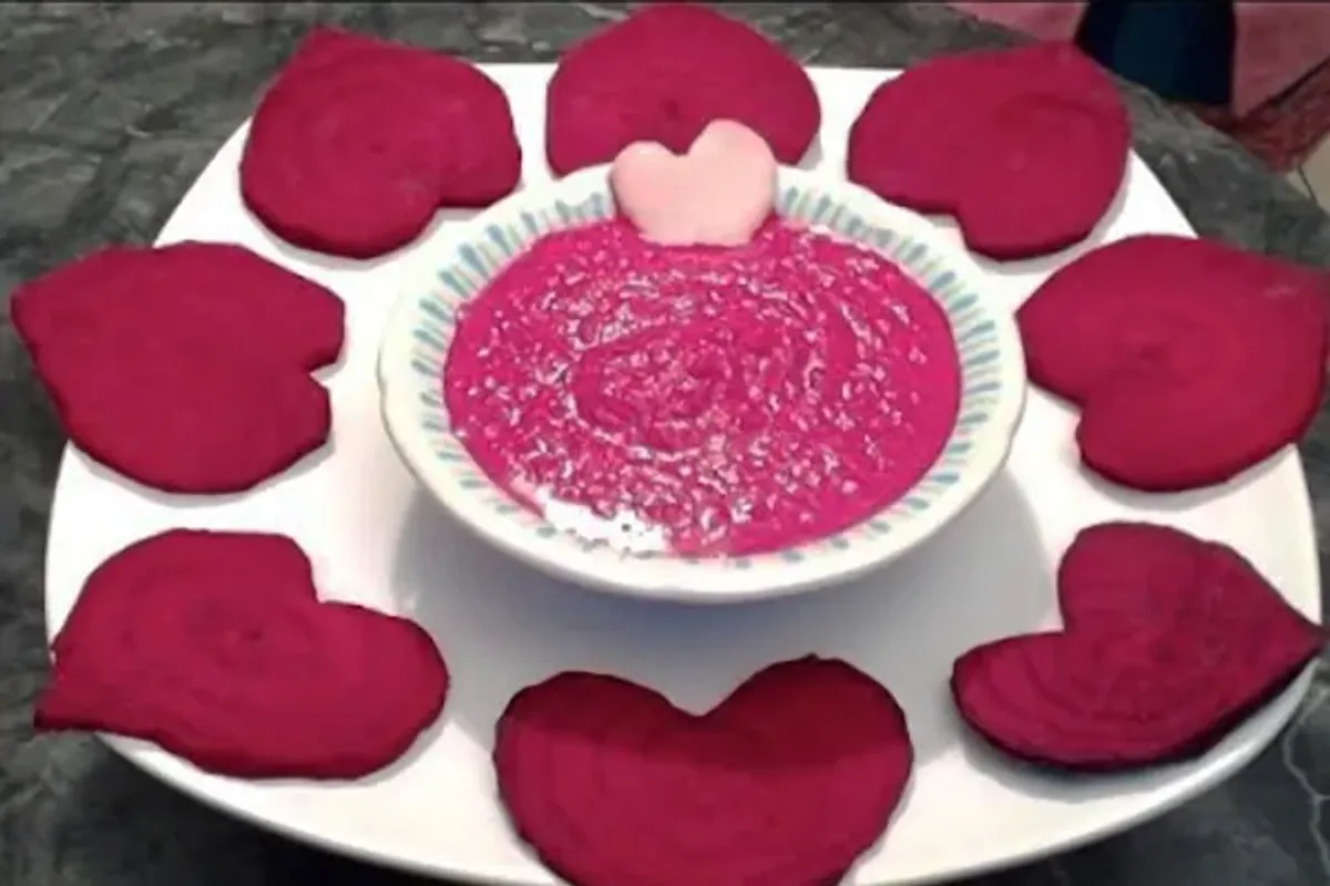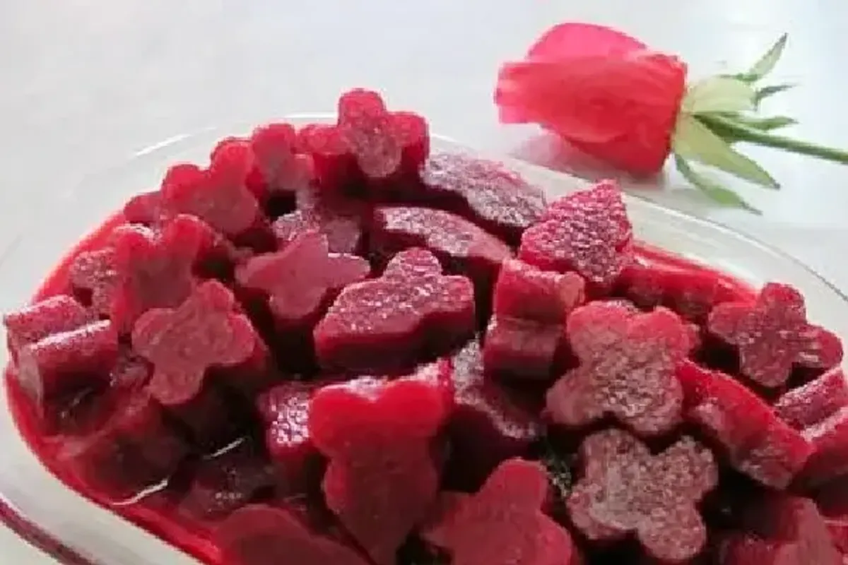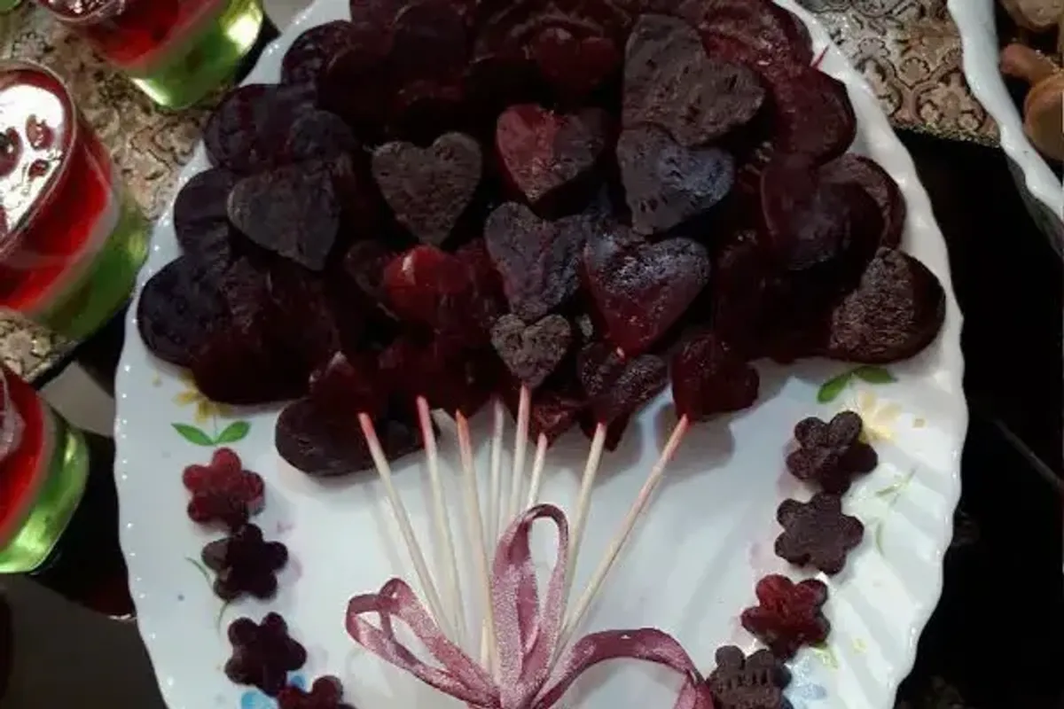 لبو را به شکل حلقههای باریک برش بزنید و با قالبهای فلزی کوچک (مانند قالب قلب، ستاره یا گل) شکل دهید. این قطعات زیبا را میتوانید در کنار سایر میوهها مثل انار و هندوانه روی سفره قرار دهید یا به سالاد اضافه کنید.