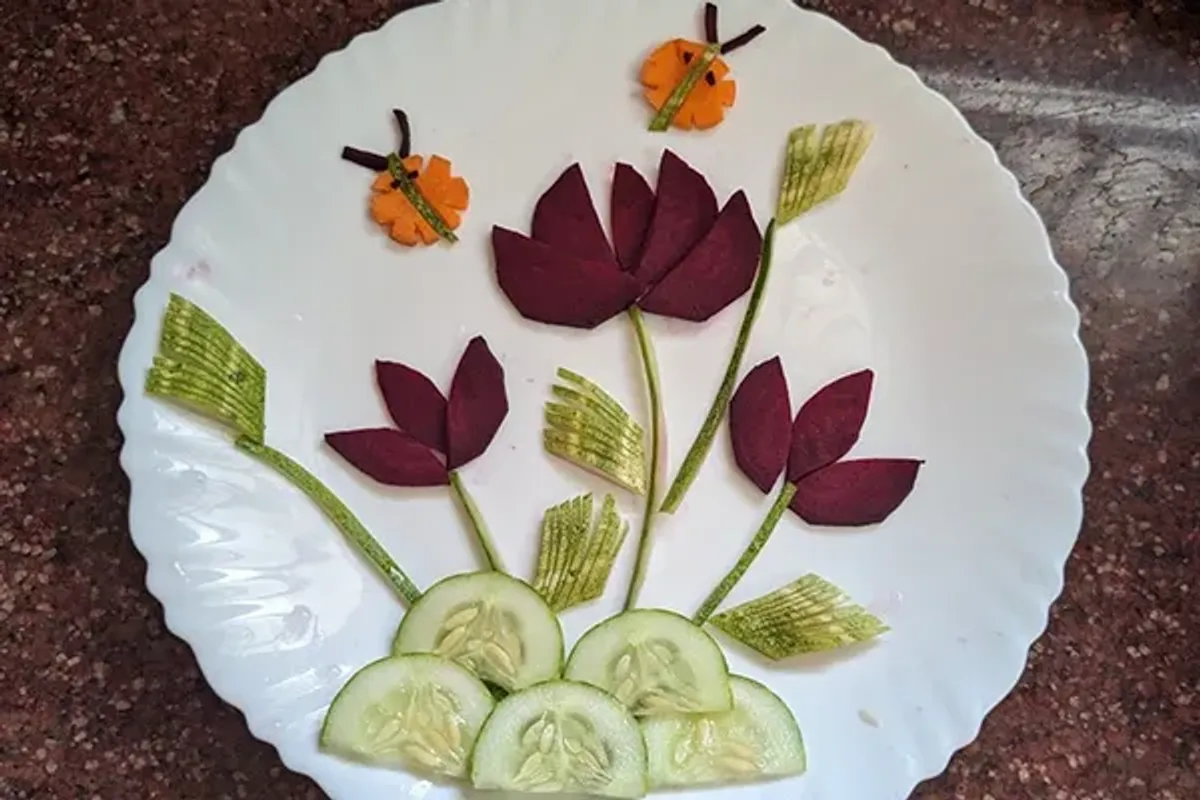 با یک چاقوی تیز، روی سطح لبو طرحهایی شبیه گل ایجاد کنید. سپس آن را به صورت ایستاده یا خوابیده در بشقاب قرار دهید. این روش نیاز به کمی صبر و دقت دارد، اما نتیجهای بسیار خیرهکننده خواهد داشت.