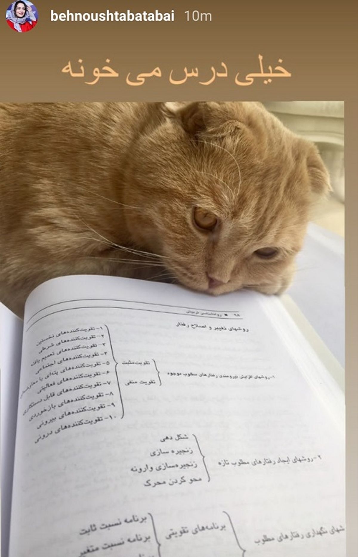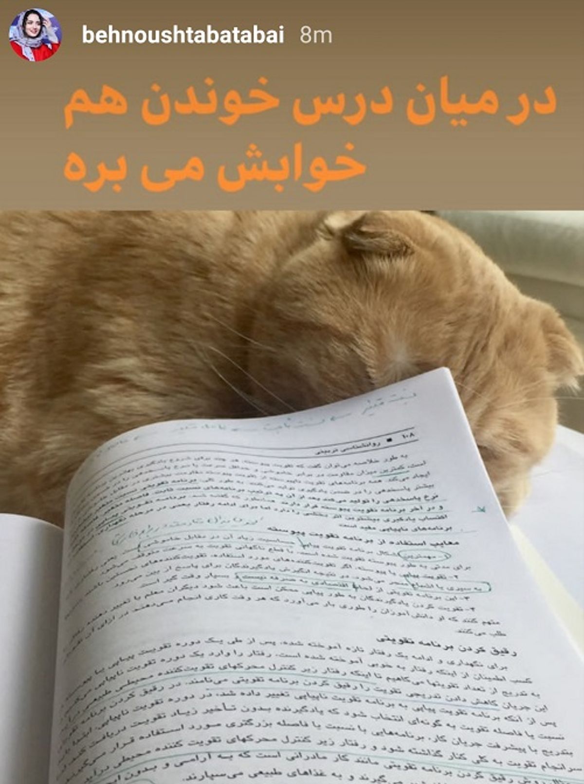 بهنوش طباطبایی که جز بازیگران تحصیل کرده است و دکترای روانشناسی دارد، تصاویری از مطالعه کردن به همراه گربه اش در اینستاگرام منتشر کرده است.
