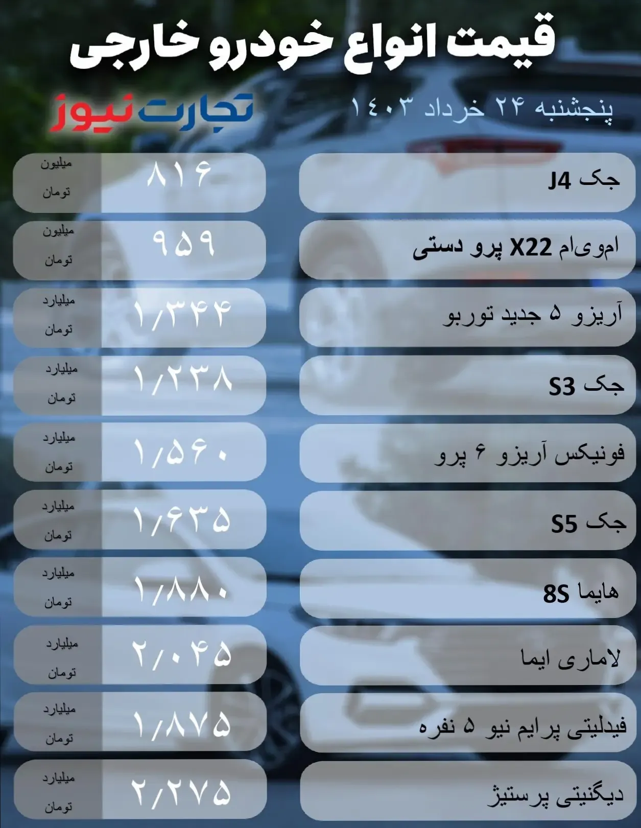 قیمت خودرو امروز، پنجشنبه، 24 خرداد 1403، در اکثر محصولات داخلی و مونتاژی کاهشی گزارش میشود. اما این روند کاهشی در بین محصولات ایران خودرو بیشتر از سایر شرکتها بوده است. همچنین تعدادی از محصولات همانند روزهای گذشته بهصورت ثابت به کار خود ادامه دادند.
