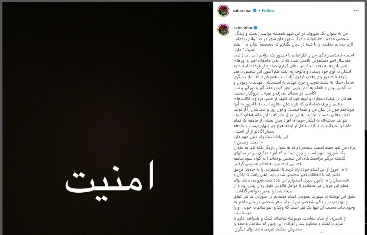 به گزارش عصرایران، صابر ابر نوشته است: «من به عنوان یک شهروند در این شهر همیشه مراقب زیست و زندگی شخصی خودم، اطرافیانم و دیگر شهروندان شهر در حد توانم بودهام. لازم میدانم مطلبی را با شما در میان بگذارم که مشخصاً اشاره به “ عدم امنیت“ دارد.