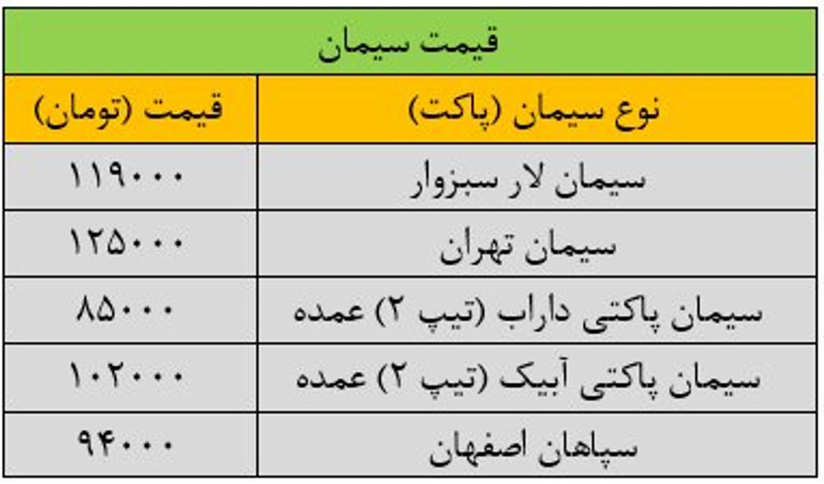 همچنین سیمان پاکتی آبیک (تیپ ۲) عمده ۱۰۲ هزار تومان و سیمان سپاهان اصفهان هر پاکت ۹۴ هزار تومان است.