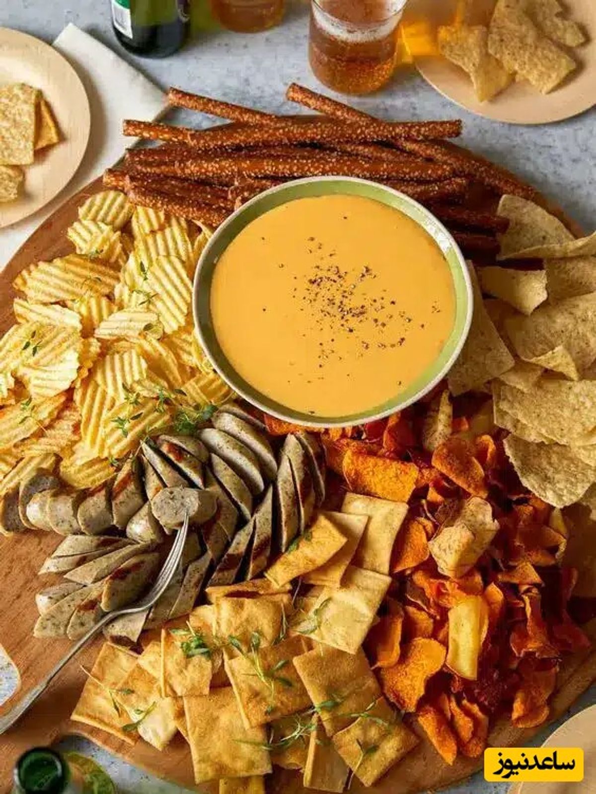 خوراکی های پنیری ( ناچو، مینی ساندویچ پنیری مرغ و وافل، پوتینه، کوکتل توپی و انواع غذاهای پنیری دیگر می توانند تشکیل دهنده ی این سینی مزه لذیذ باشند )