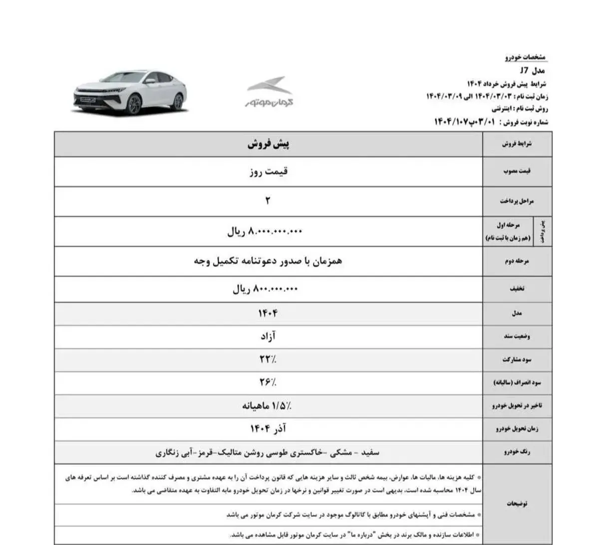 شرایط پیش فروش خودرو KMC J7 توسط کرمان موتور اعلام شد.