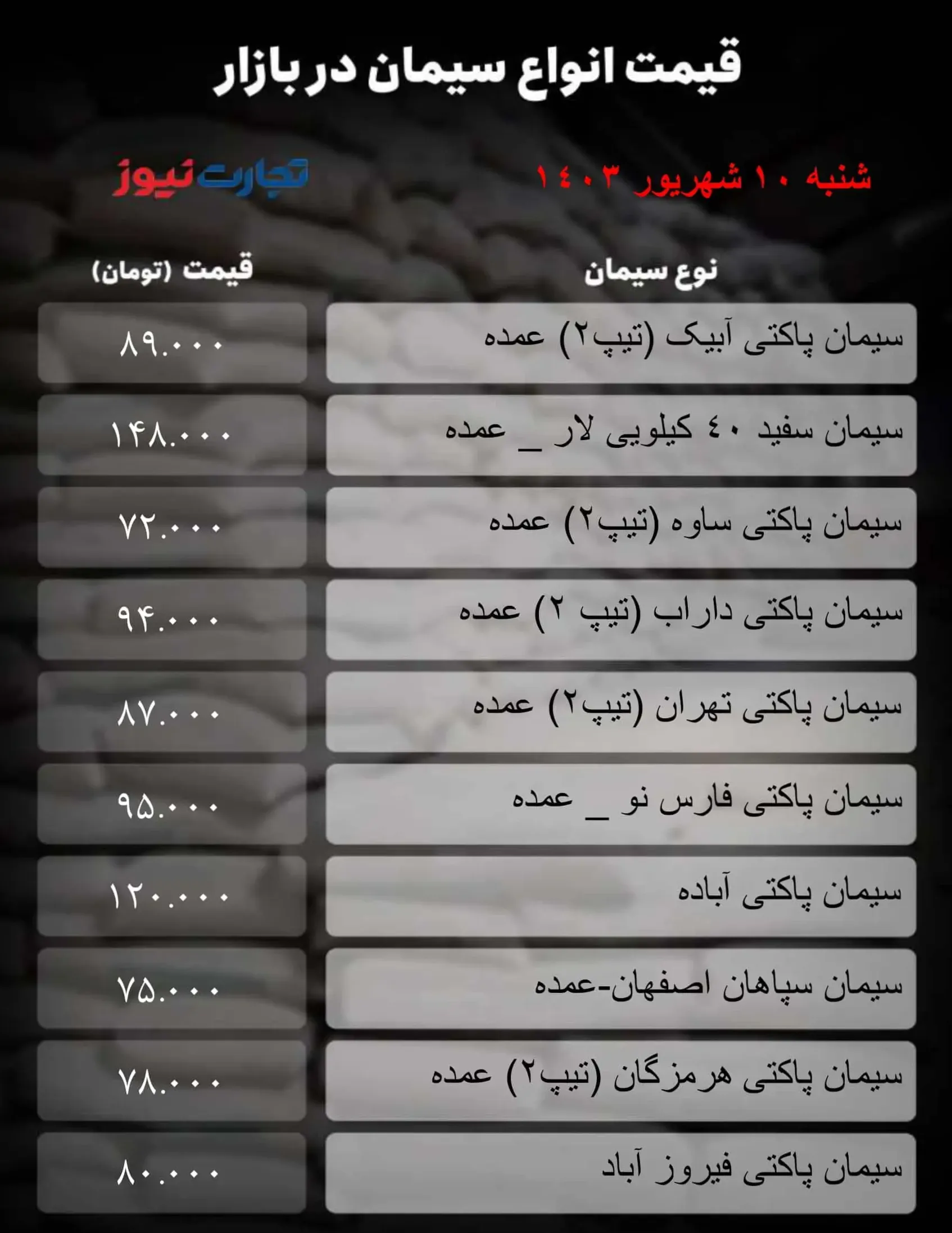 قیمت سیمان امروز شنبه 10 شهریور1403 مشخص شد.