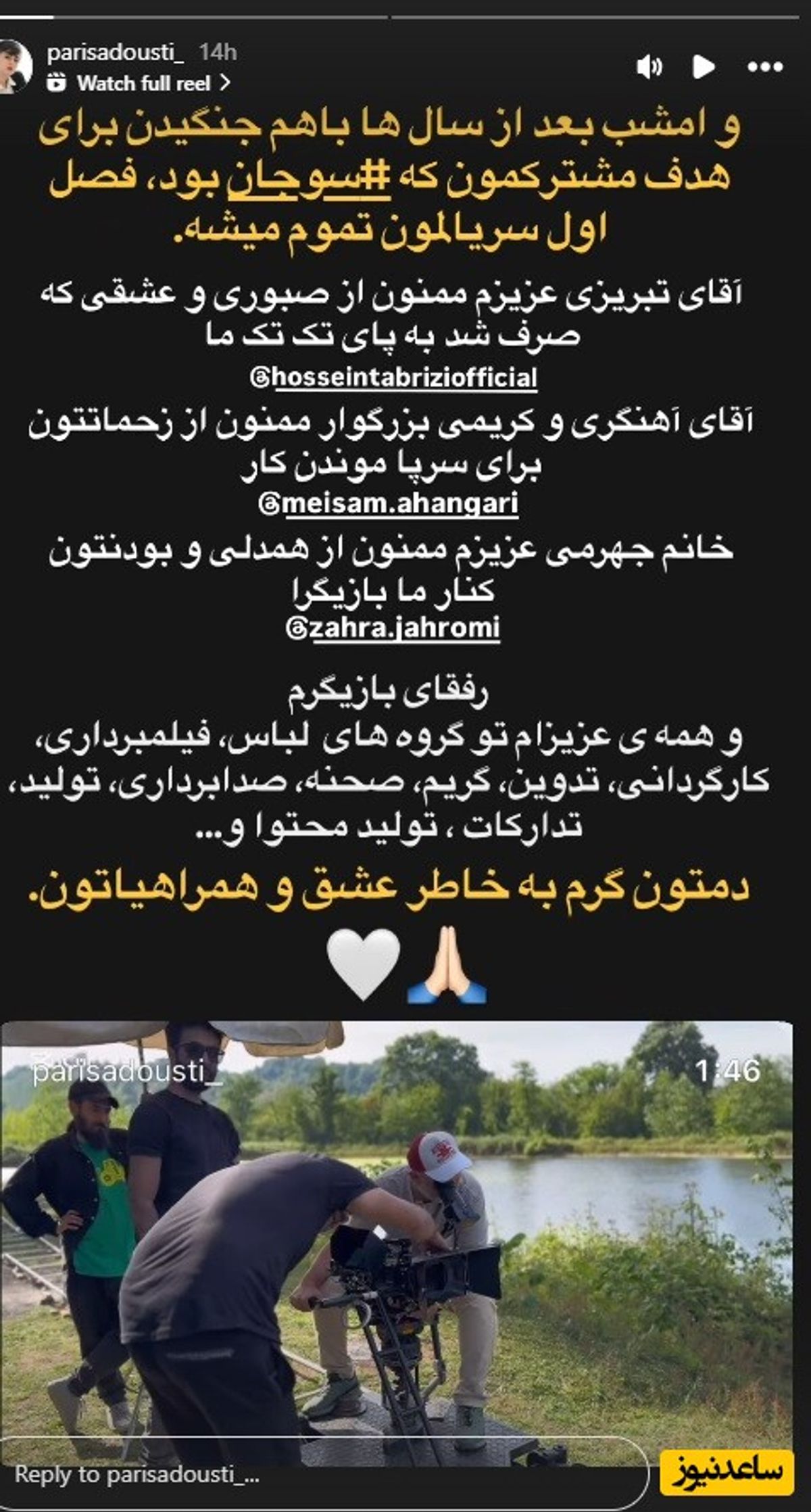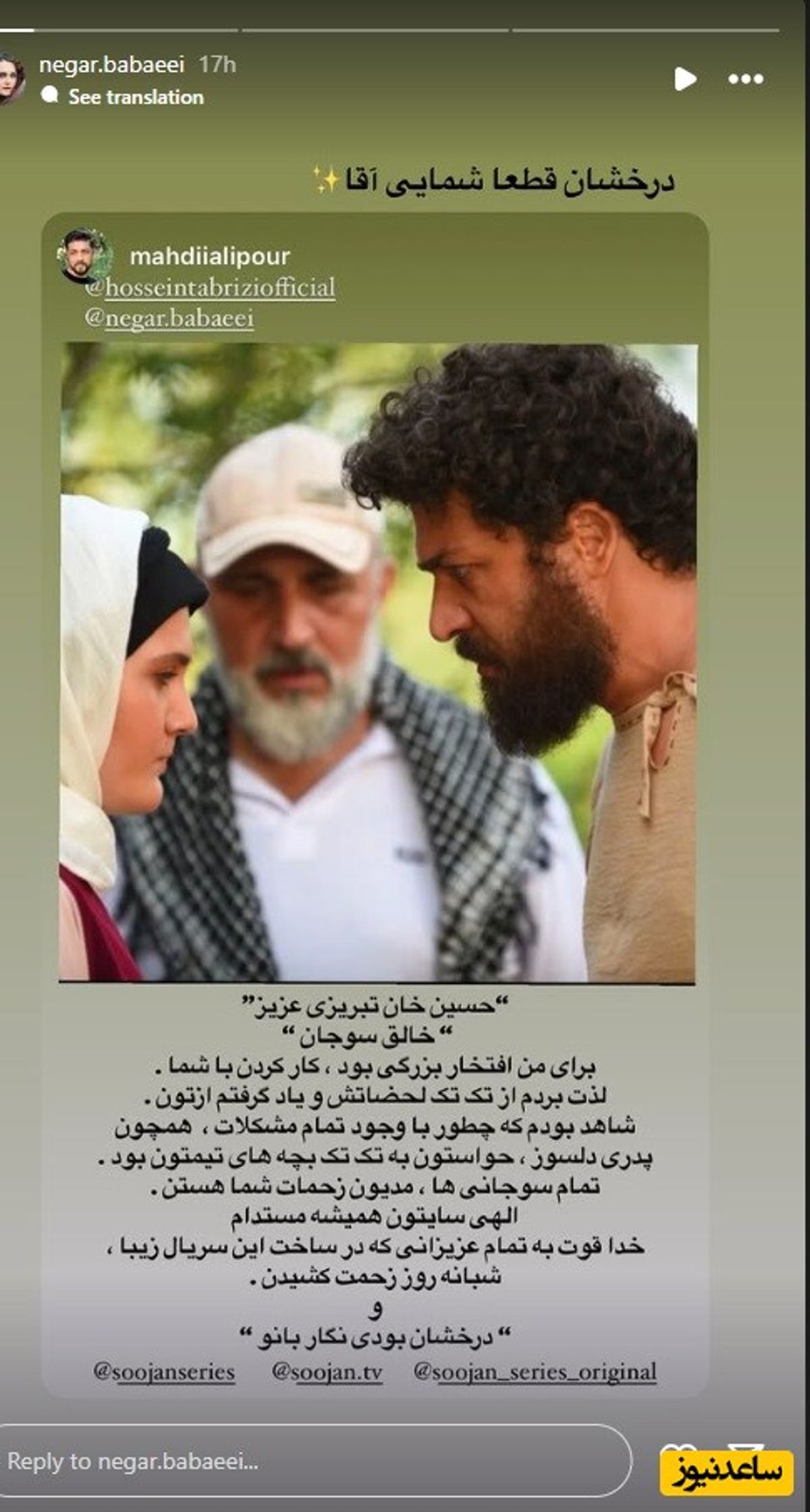 به بهانه پایان سریال سوجان، نگاهی میاندازیم به استوریهای بازیگران این سریال. با ما همراه باشید و تصاویر منتشر شده را مشاهده فرمایید.