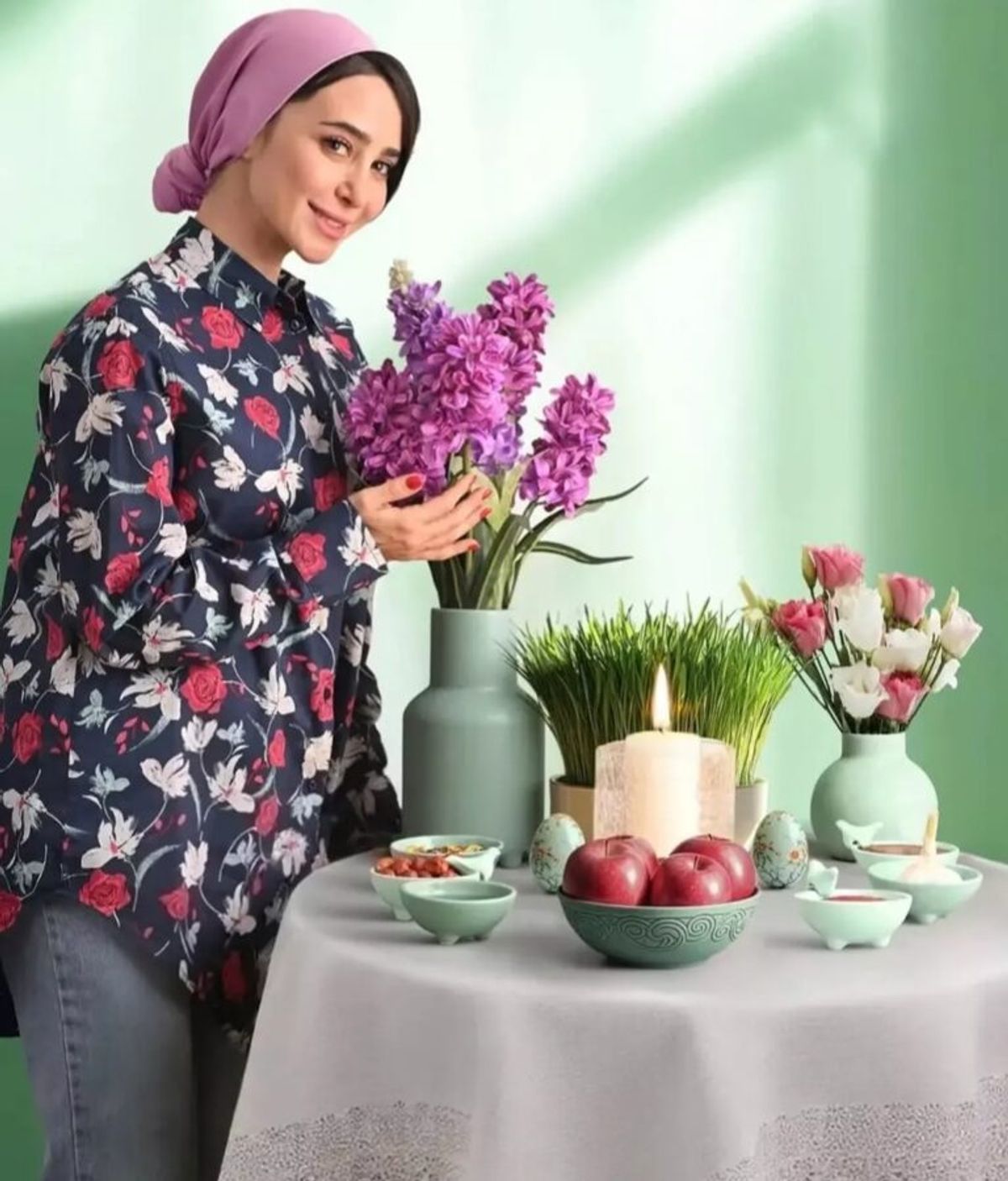 الناز حبیبی به تازگی تصویری از خودش در کنار سفره هفت سین منتشر کرده است. البته این تصویر تبلیغاتی برای یک برند محصولات بهداشتی بوده و احتمالا هم این هفت سین و هم استایل او مربوط به تیم تبلیغات این برند باشند. به هرحال شومیز گلدار او جذابیت خاصی با شلوار جینش پیدا کرده و استایل او را مثل همیشه شیک کرده است.