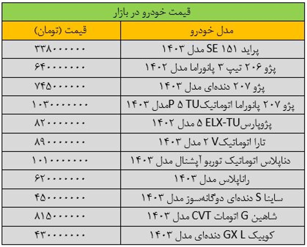در این میان، قیمت پژو ۲۰۶ تیپ ۳ پانوراما مدل ۱۴۰۲ در حدود ۶۴۰ میلیون تومان قیمت خورده است. پژو ۲۰۷ دندهای مدل ۱۴۰۳ نیز ۷۴۵ میلیون تومان به فروش رفت. همچنین پژو ۲۰۷ پانوراما اتوماتیک TU۵P مدل ۱۴۰۳، یک میلیارد و ۳۰ میلیون تومان به فروش رفت. پژو ۲۰۷ تیپ ۵ مدل ۱۴۰۲ نیز ۶۶۰ میلیون تومان قیمت پیدا کرد. اما پژوپارس ELX-TU۵ مدل ۱۴۰۲ به قیمت ۸۲۰ میلیون تومان رسید. پژوپارس LX مدل ۱۴۰۲ هم ۸۷۰ میلیون تومان قیمت پیدا کرد.