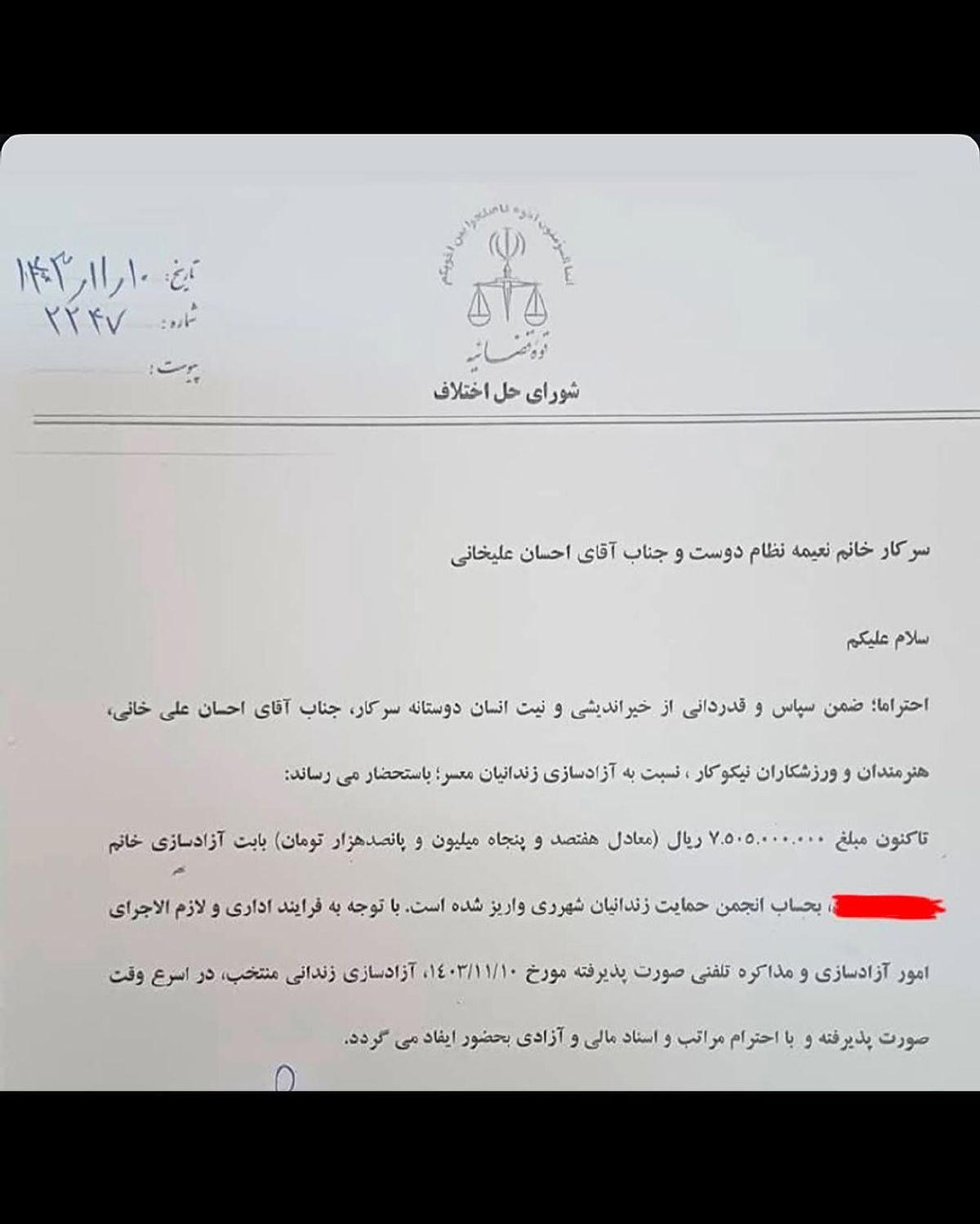 حالا احسان علیخانی و نعیمه نظام دوست با کمک هم و همکاری مردم کار بزرگی انجام دادند و زمینه آزادی یک زن را پس از ۱۰ سال از زندان فراهم کردند.