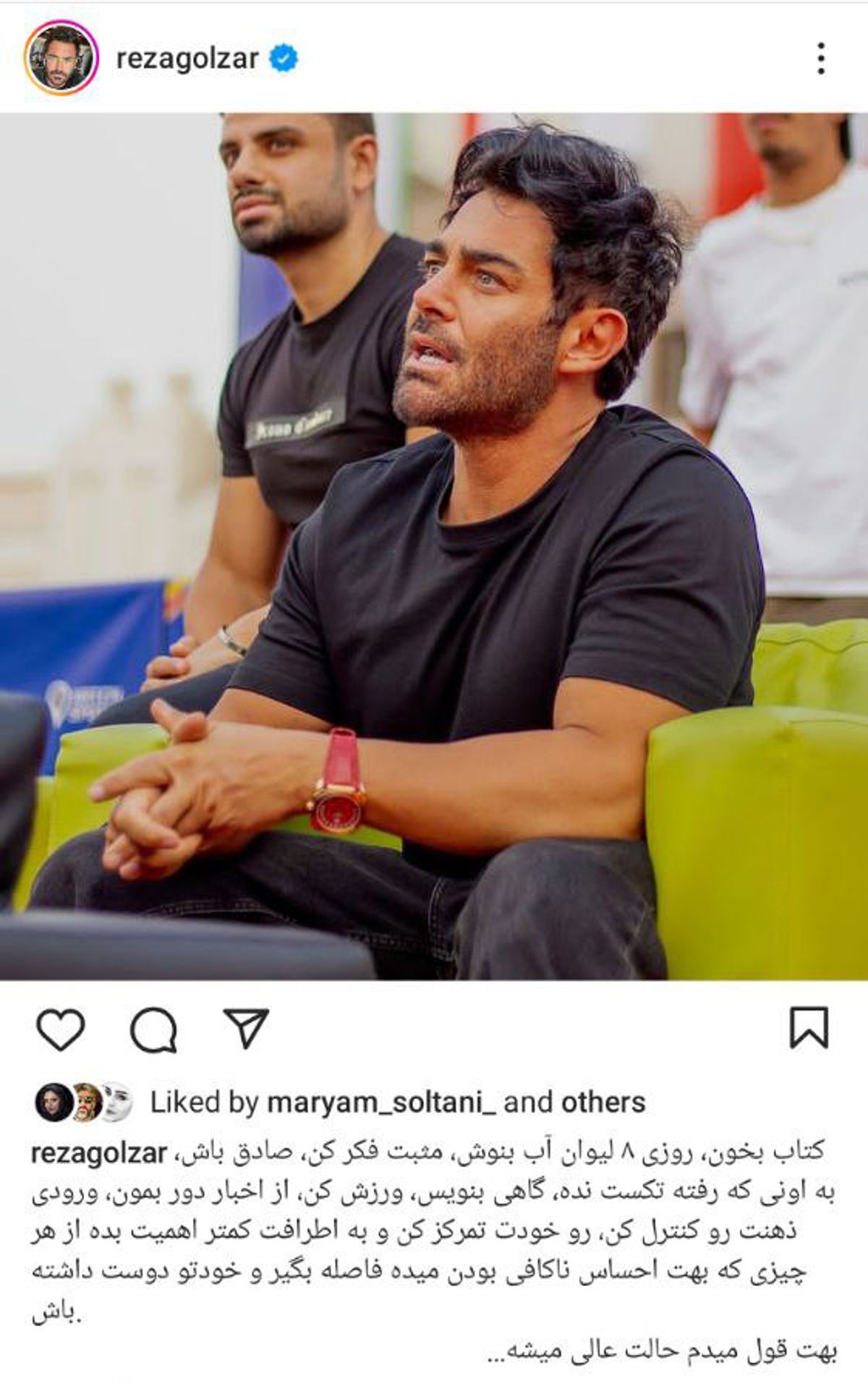 محمدرضا گلزار با انتشار عکس زیر نوشت: کتاب بخون، روزی ۸ لیوان آب بنوش، مثبت فکر کن، صادق باش، به اونی که رفته تکست نده.