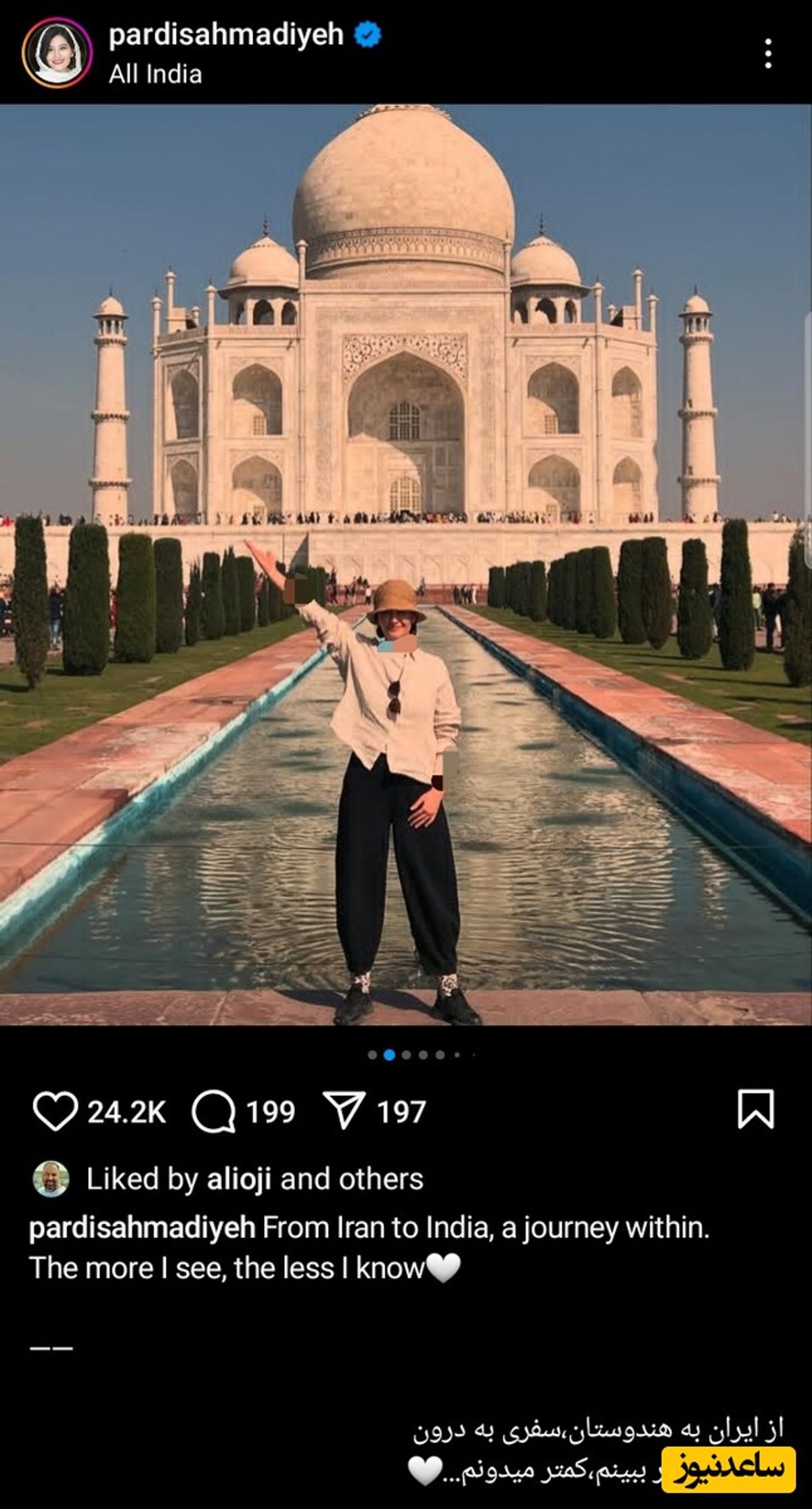 پردیس احمدیه بازیگر مشهور فیلم پول و پارتی و پوست شیر در صفحه اینستاگرامش تصویری از سفر اخیرش به هندوستان منتشر کرده است که در ادامه مشاهده میفرمایید.