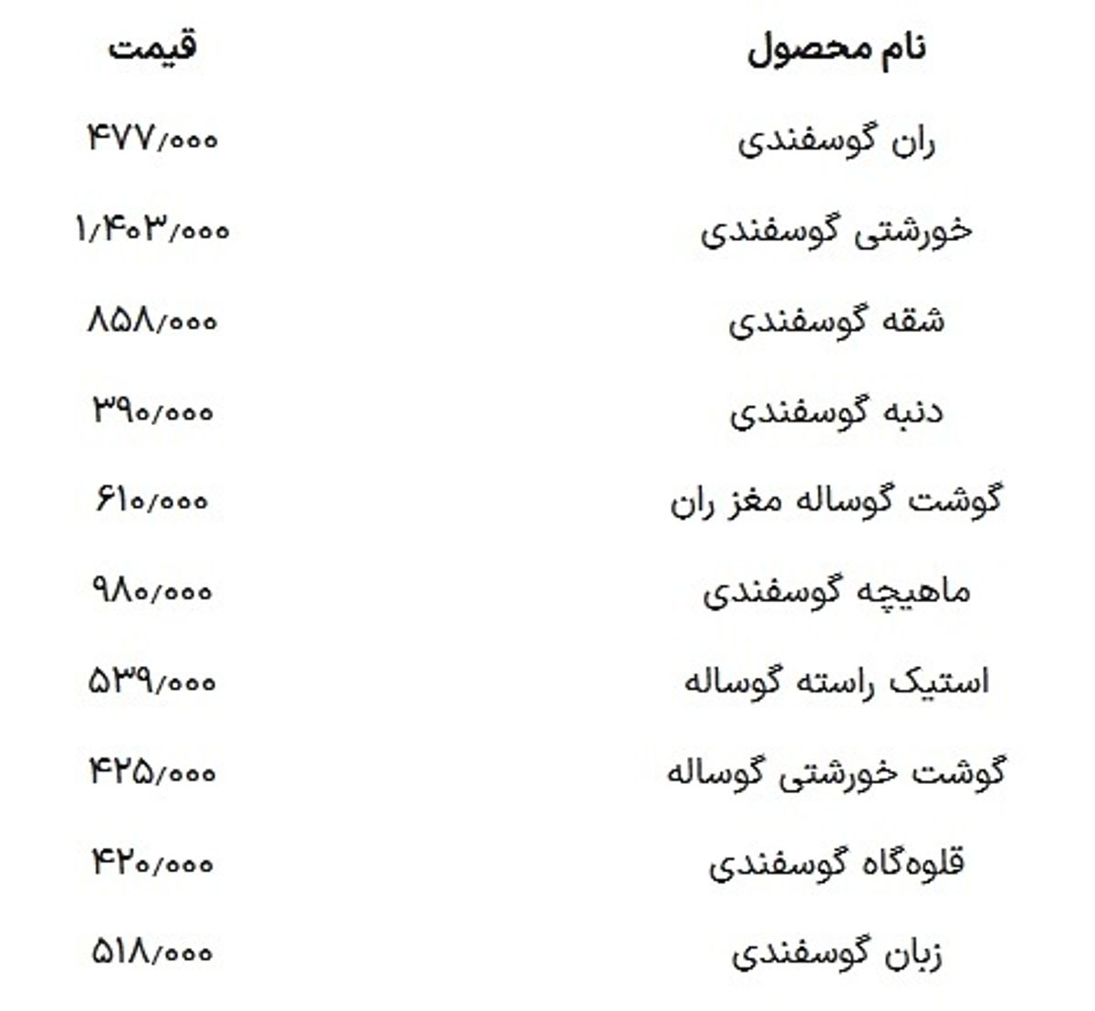 ماهیچه ران گوسفندی نیز به ازای هر کیلوگرم ۷۵۰ هزار تومان وراسته گوسفندی بدون استخوان با نرخ نسبتاً بالا و مورد استفاده قشر خاص، یک میلیون و ۱۰۰ هزار تومان توزیع میشود.