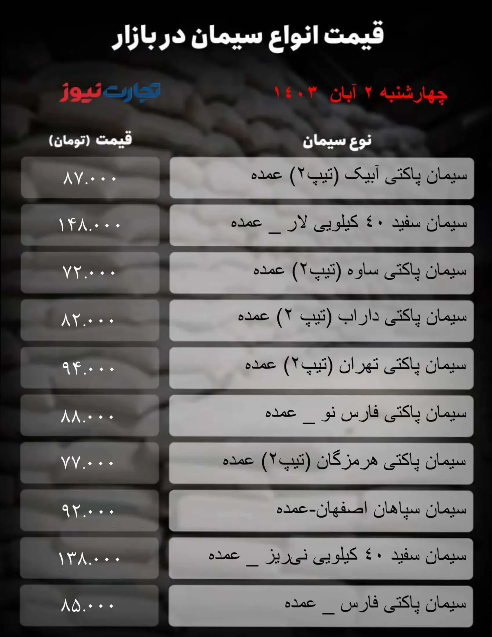 قیمت سیمان امروز چهارشنبه ۲ آبان 1403 | بازار سیمان در برابر نوسان قیمت مقاوم شد