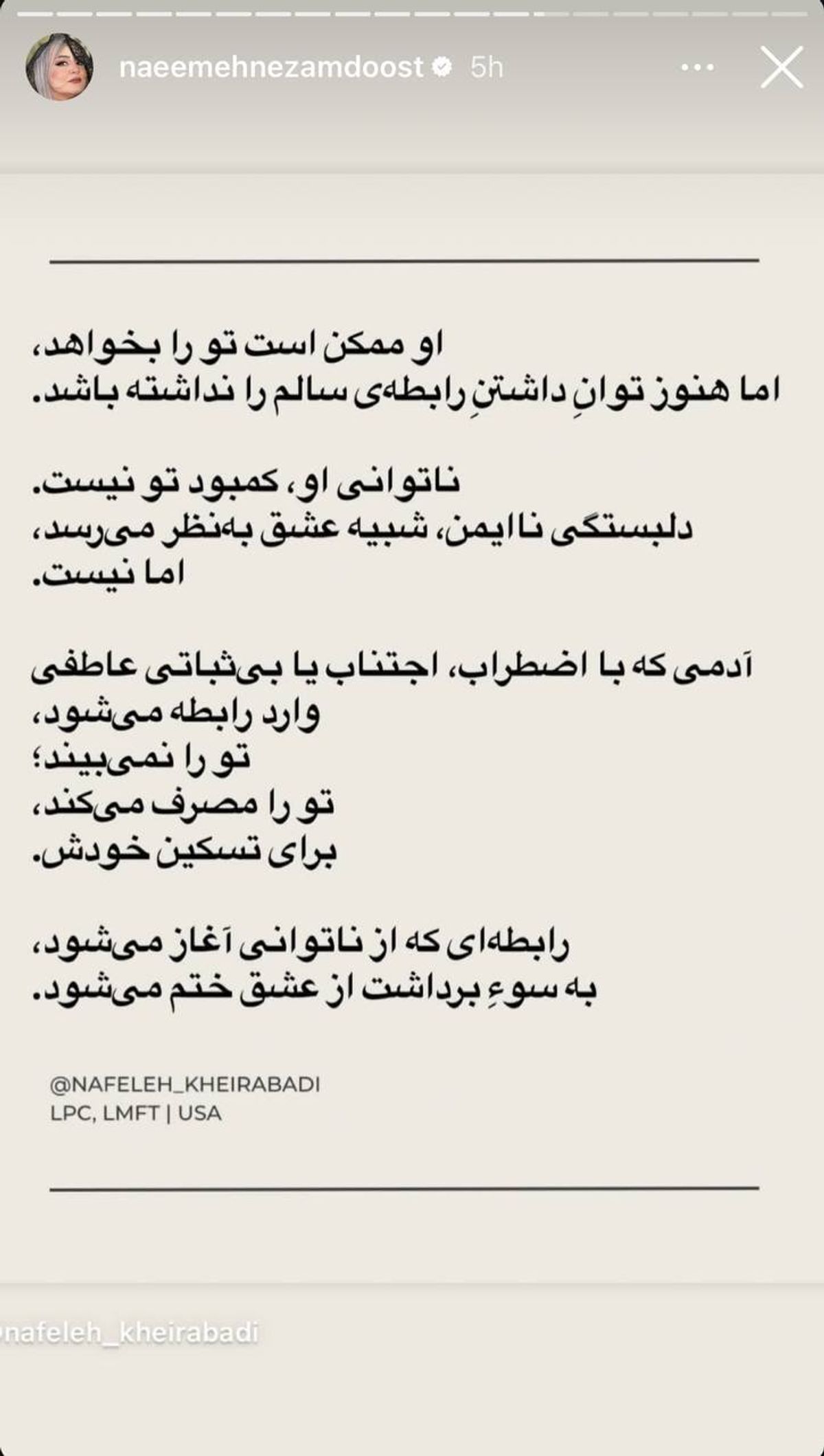 مخاطب خاص استوری های غمگین نعیمه نظام دوست کیست؟
