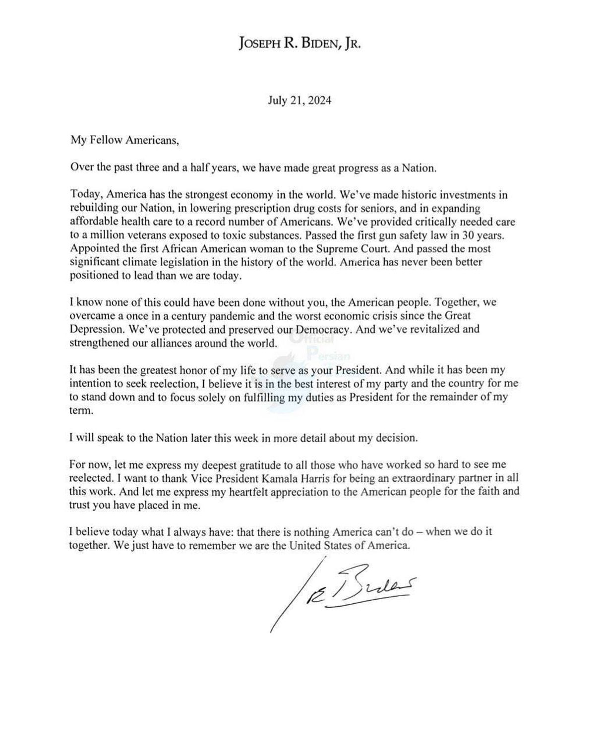 جو بایدن رئیس جمهوری آمریکا در حالی از رقابتهای انتخابات ریاست جمهوری ۲۰۲۴ کناره گیری کرد که درخواستهای درون حزب وی برای کناره گیری وی افزایش پیدا کرده بود.